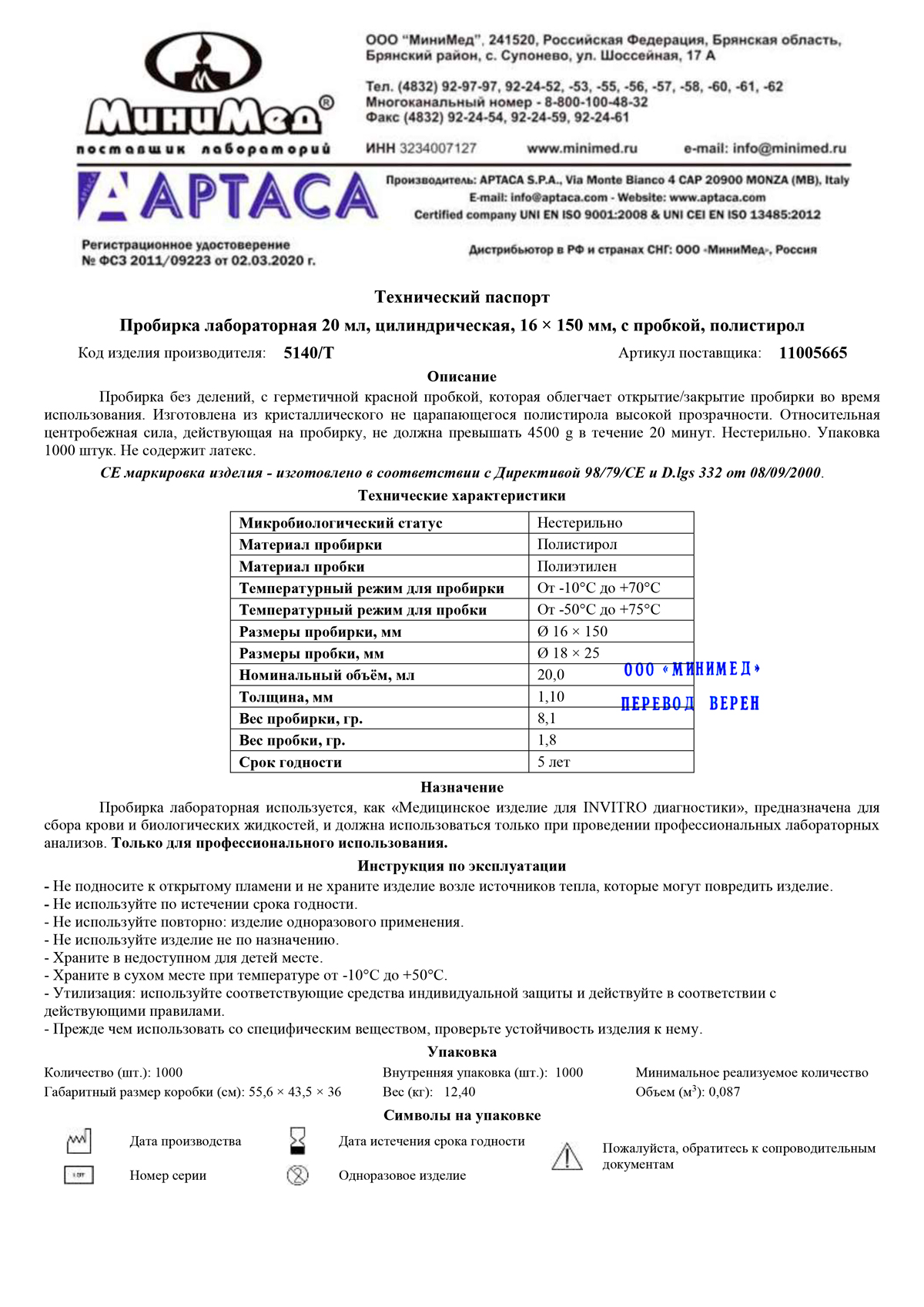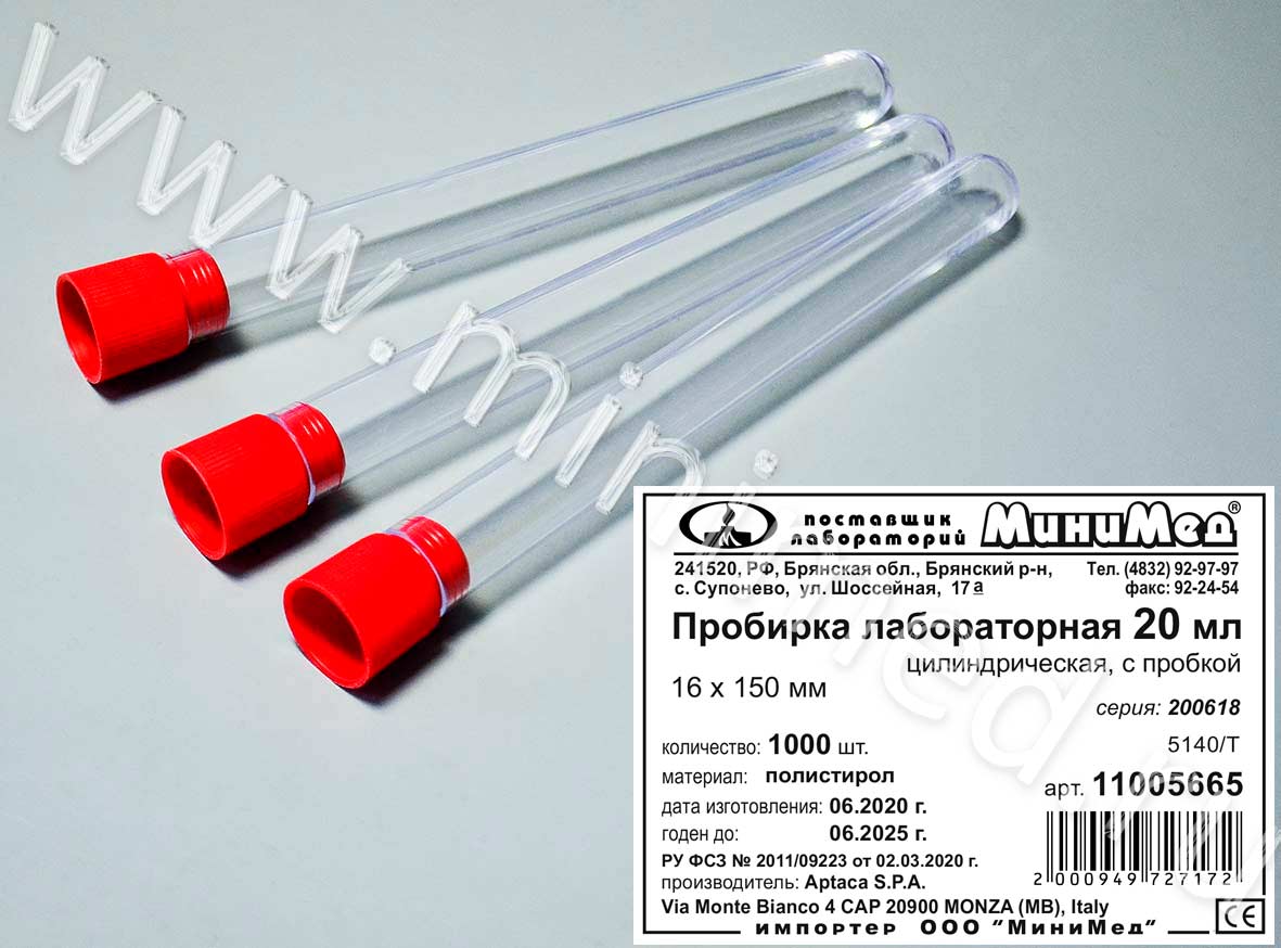 Пробирка лабораторная 20 мл, цилиндрическая,16×150 мм, п/с, с пробкой ,уп.1000 шт.,Aptaca