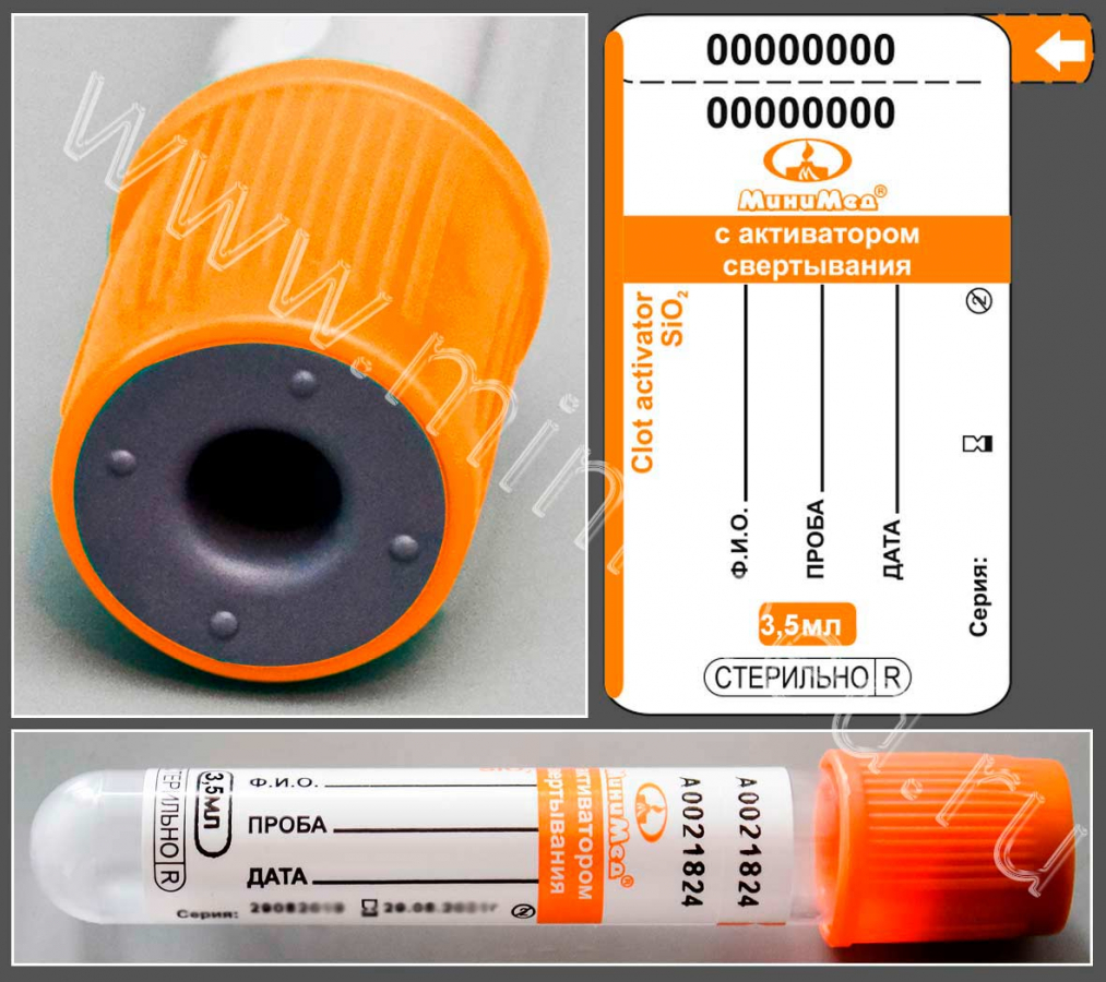 Стенки пробирок покрыты сухим активатором образования сгустка для ускорения свертывания крови. Смешивание крови с ним не влияет на результат анализов. Ускорение процесса свертывания крови существенно сокращает время подготовки биологической пробы.