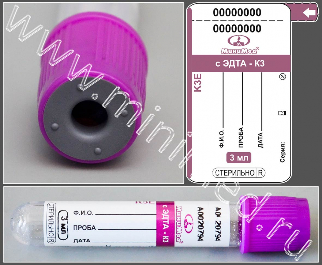 Пробирка вакуумная МиниМед с К3-ЭДТА, 3 мл, 13×75мм, фиолетовый, ПЭТФ, уп.100 шт,