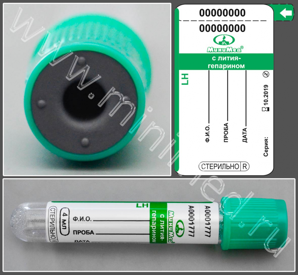 Пробирка вакуумная МиниМед с лития гепарином, 4 мл, 13×75 мм, зеленый, ПЭТФ, уп.100 шт,