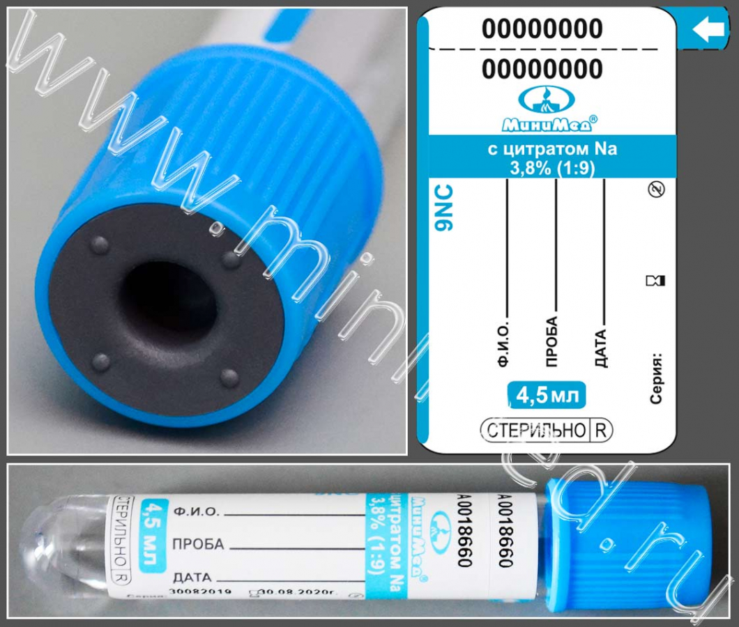 Пробирка вакуумная МиниМед с цитратом натрия 3,8%, 4,5 мл,13*75 мм, голубой, ПЭТФ,уп.100 шт,