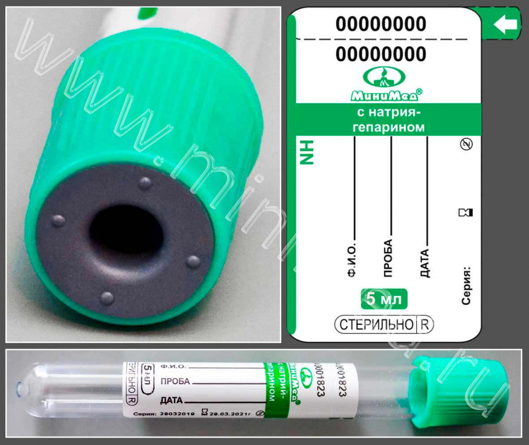 Пробирки используются для подсчета клеток крови и исследования параметров плазм. При смешивании с забранным материалом гепарин блокирует активность тромбина и тормозит переход растворимого фибриногена в нерастворимый фибрин, инактивируя необратимо факторы свертывания.