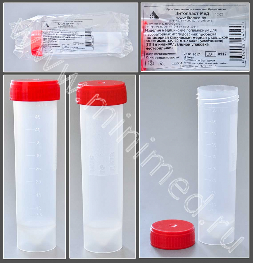 Пробирка полимерная коническая мерная с крышкой вместимостью 50 мл (с юбкой устойчивости), п/п, нестерильная, инд.уп/уп.350шт,Литопласт