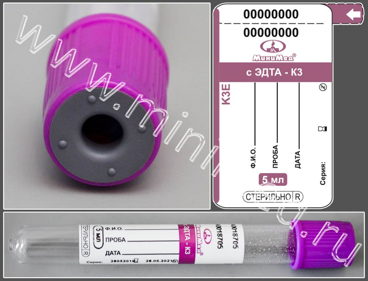 Пробирка вакуумная МиниМед с К3-ЭДТА, 5 мл, 13×100мм, фиолетовый, ПЭТФ, уп.100 шт,