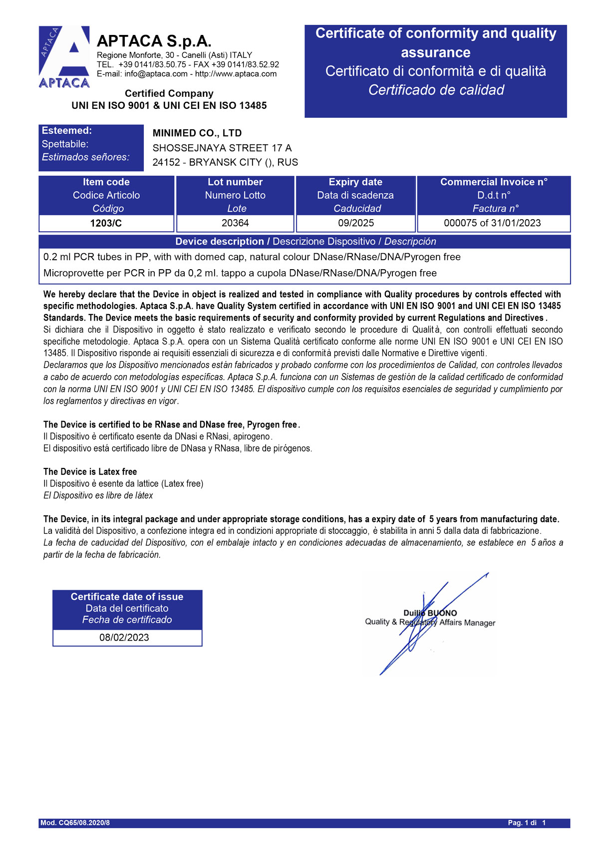 - Сертификат-1203-С. Микропробирка 0,2 мл, для ПЦР,с выпуклой крышкой. Лот 20364 д