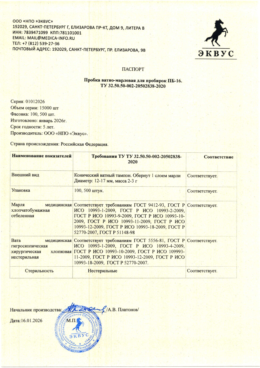Пробка ватно-марлевая для пробирок ПБ-16, нестерил, 500шт/уп