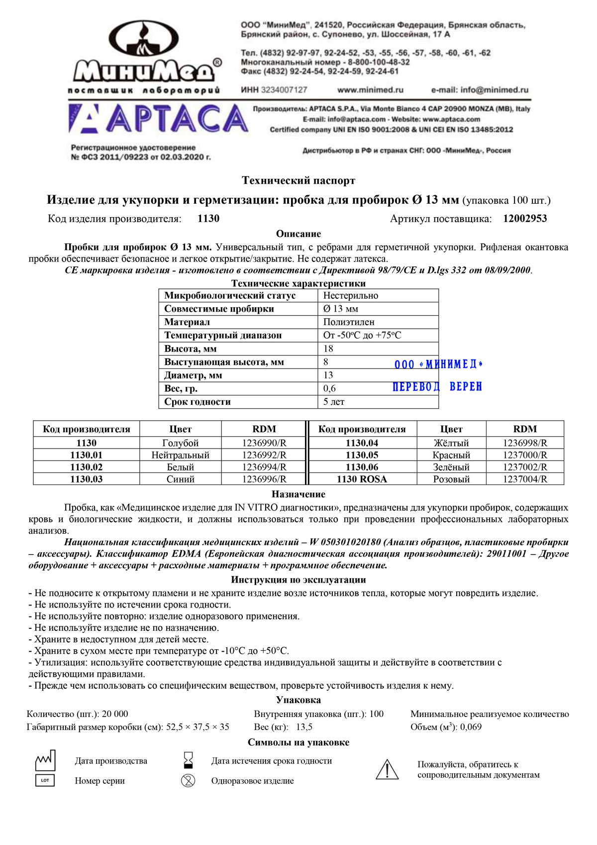 Изделие д/укупорки и герметизации: пробка для проб. диам.13 мм,п/эт,уп.100 шт, Aptaca