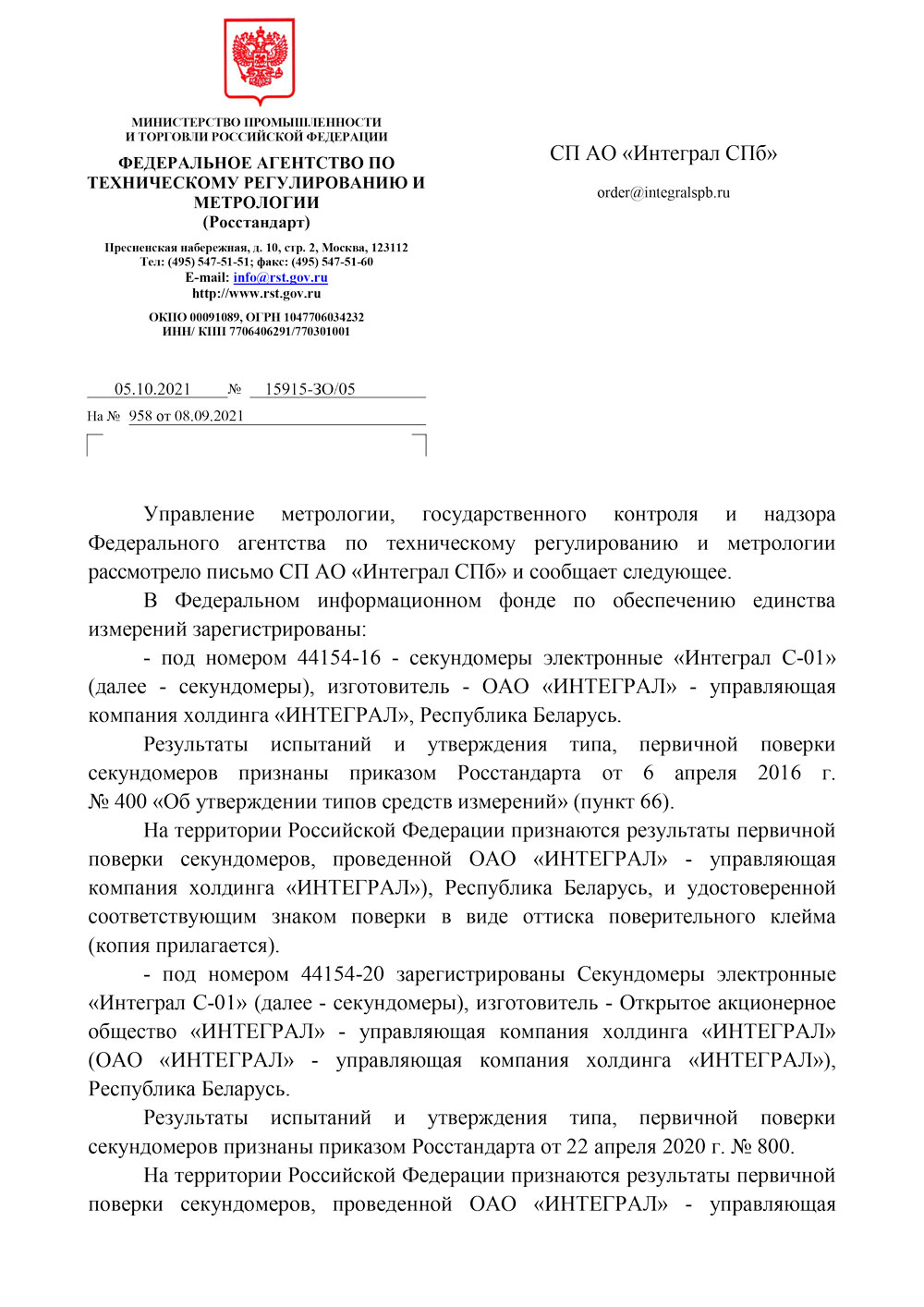 - Секундомер электронный ИНТЕГРАЛ С-01. Исх. письмо от 26.09.2023 № 65-5733 об отс