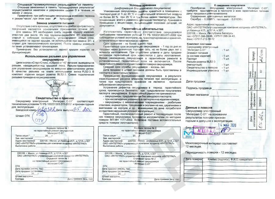 - Секундомер электронный Интеграл С-01. Сертификат ТСИ до 20.11.2025