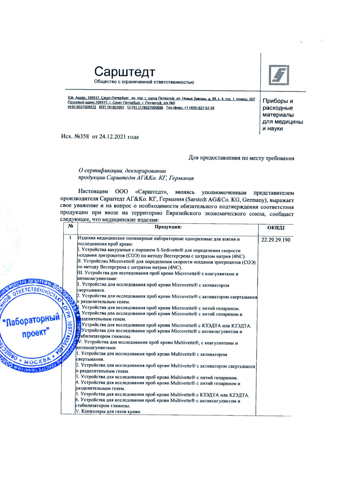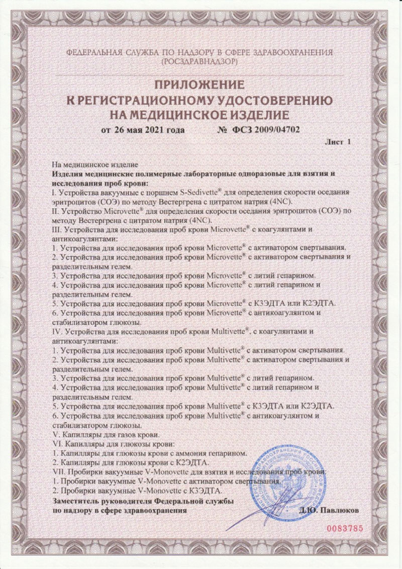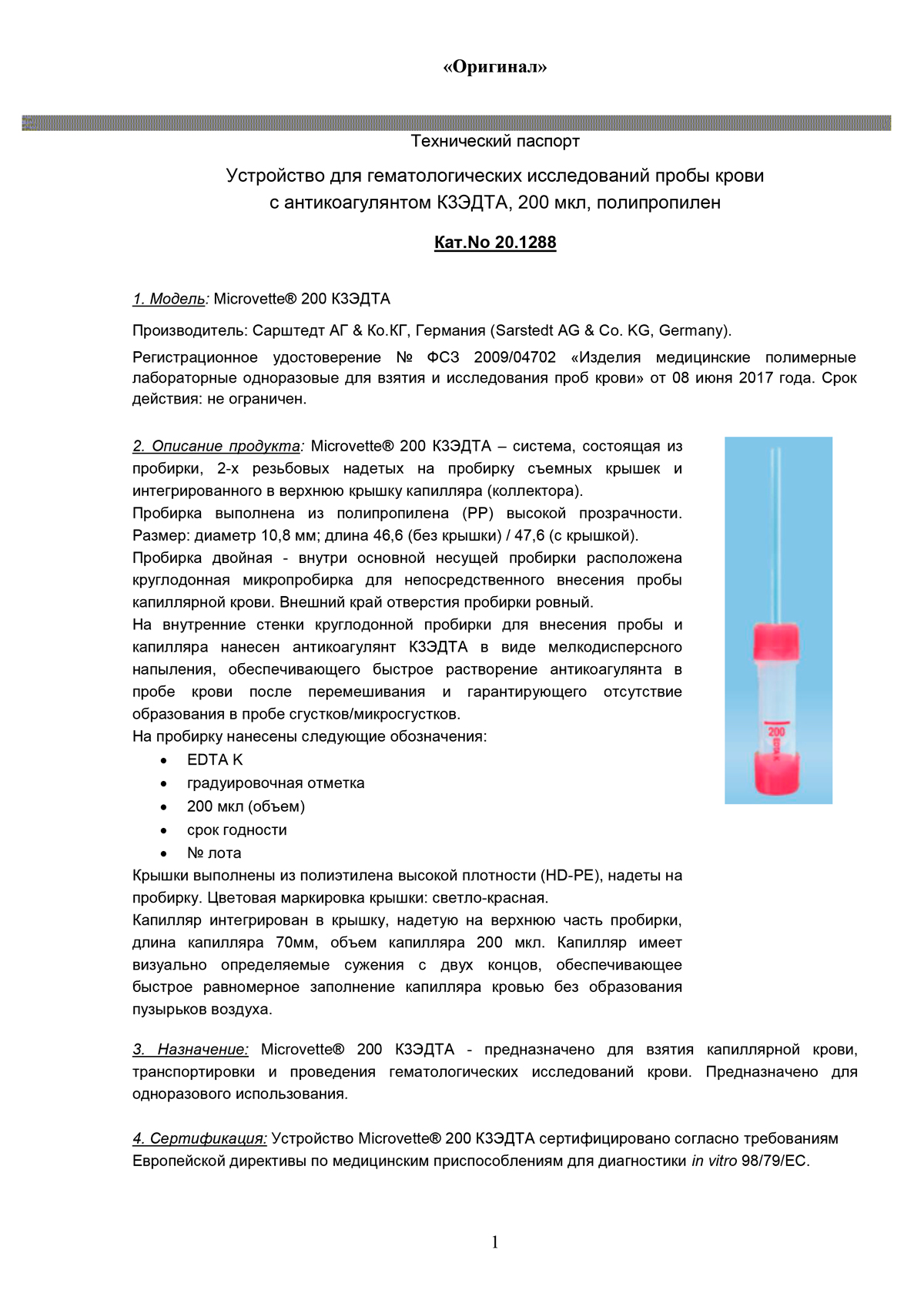 - Устройства для исследования проб крови Microvette с К3ЭДТА. Выписка из РРПП до 2
