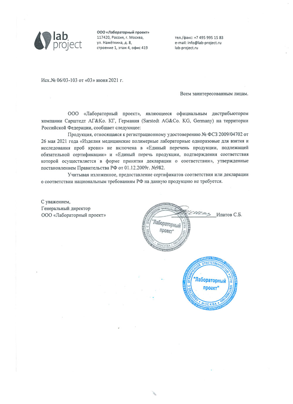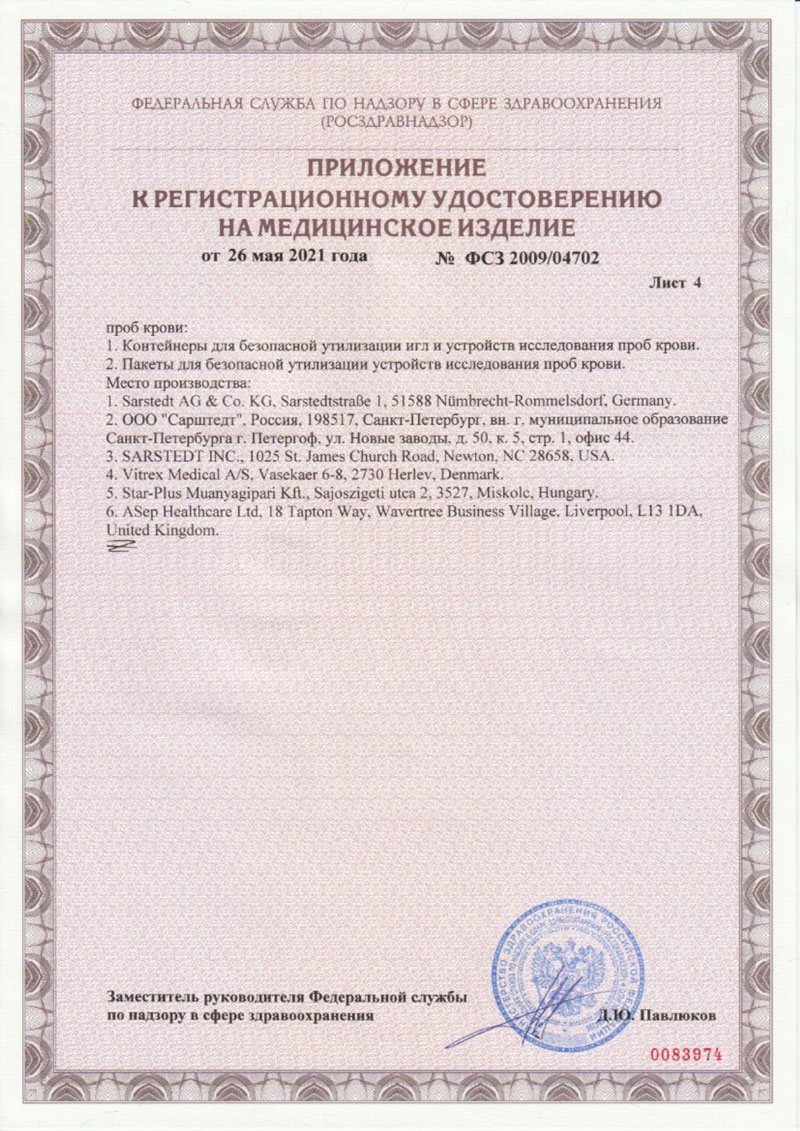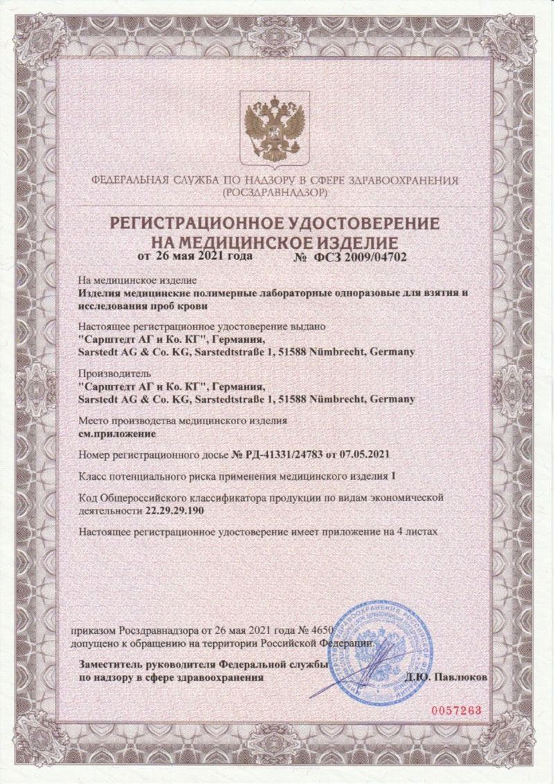 - Изделия мед полим лаб однор для взятия и исслед проб крови. Сарштедт.Германия. И