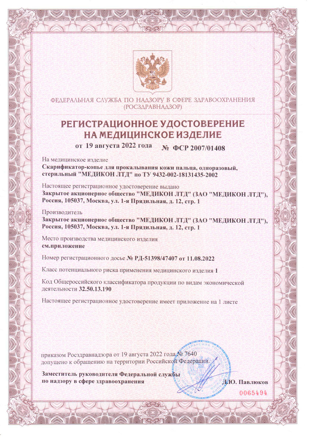 РУ № ФСР 2007/01408 от 19.08.2022 г.