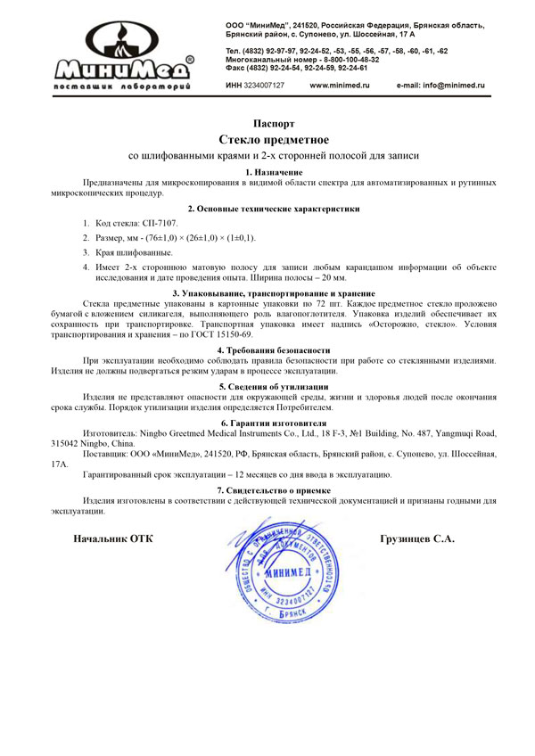 Стекло предметное СП-7107, 76*26 мм,толщ.1,0 мм, с шлиф.краями, с 2-х сторонней полосой, уп.72/3600 шт