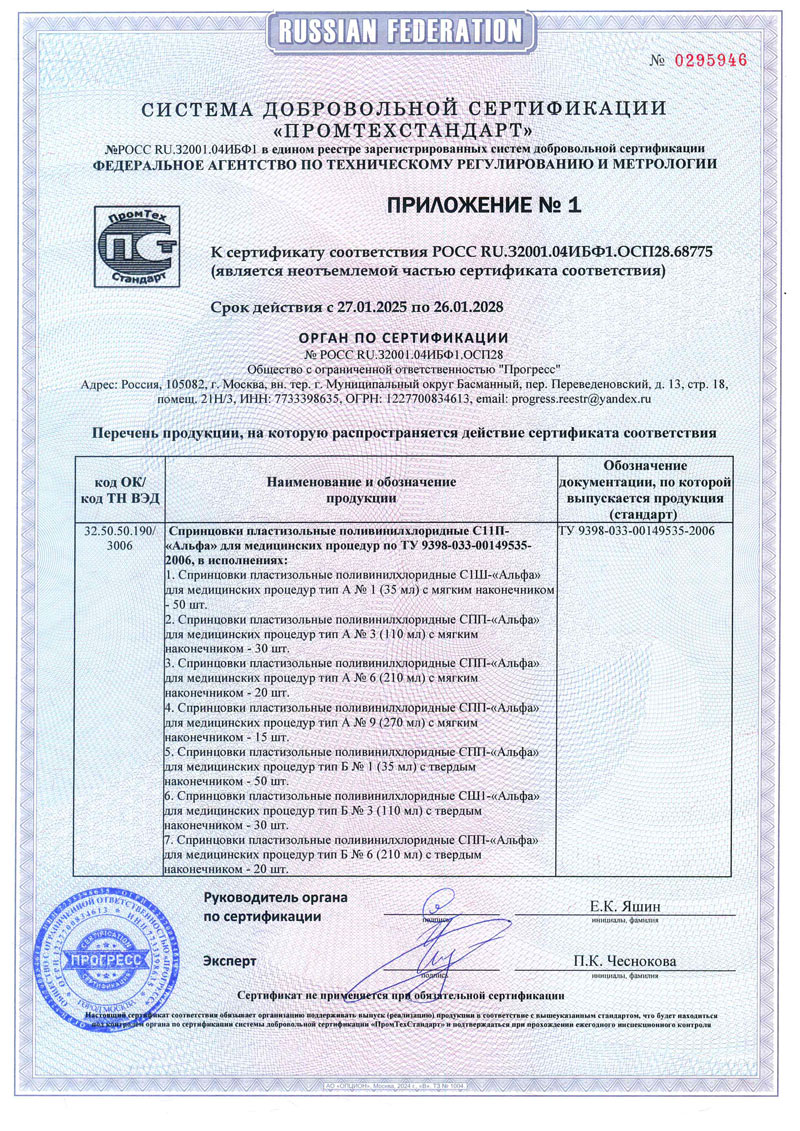 - Спринцовки ПВХ СПП-Альфа для медицинских процедур. Альфапластик. Сертификат до 2