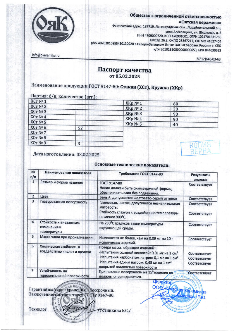 - Стакан, Кружка. Паспорт качества от 05.02.2025
