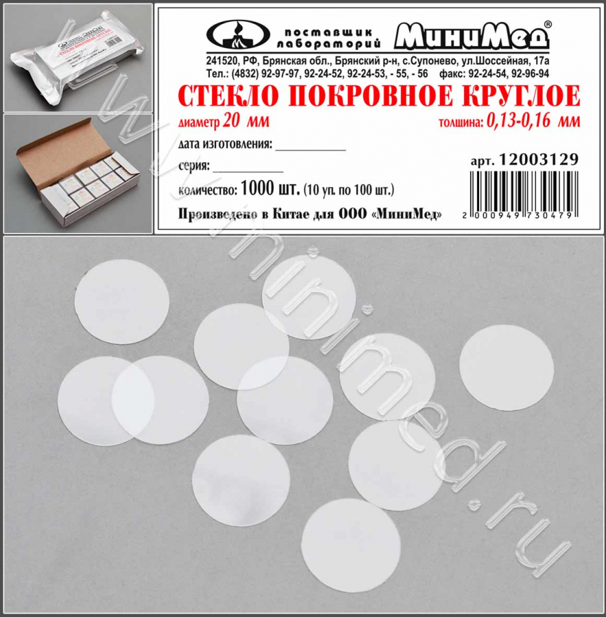 Стекло покровное круглое диам.20 мм,толщ.0,13-0,16 мм, уп.1000 шт.