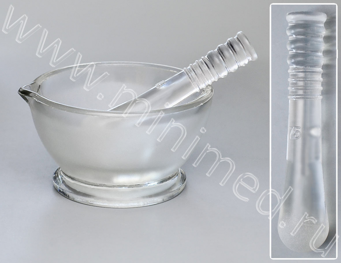 Предназначена для приготовления порошковых смесей. Для более эффективного растирания внутренняя поверхность ступки и шаровая поверхность пестика шероховатые. Изготовлена из химико-лабораторного стекла.