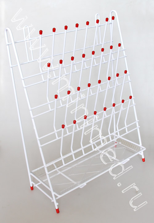 Представляет собой металлическую конструкцию, состоящую из стойки для сушки лабораторной посуды и пластикового поддона для воды. Имеет четыре ряда металлических штырьков с пластиковыми колпачками для лабораторной посуды любого вида (пробирки, колбы, стаканы и пр.). Возможна установка сушилки на мойке на ножках. Имеет крепления для подвеса сушилки на стену.