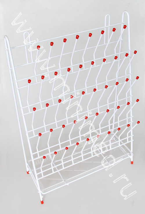Представляет собой металлическую конструкцию, состоящую из стойки для сушки лабораторной посуды и пластикового поддона для воды. Имеет пять рядов металлических штырьков с пластиковыми колпачками для лабораторной посуды любого вида (пробирки, колбы, стаканы и пр.). Возможна установка сушилки на мойке на ножках. Имеет крепления для подвеса сушилки на стену.