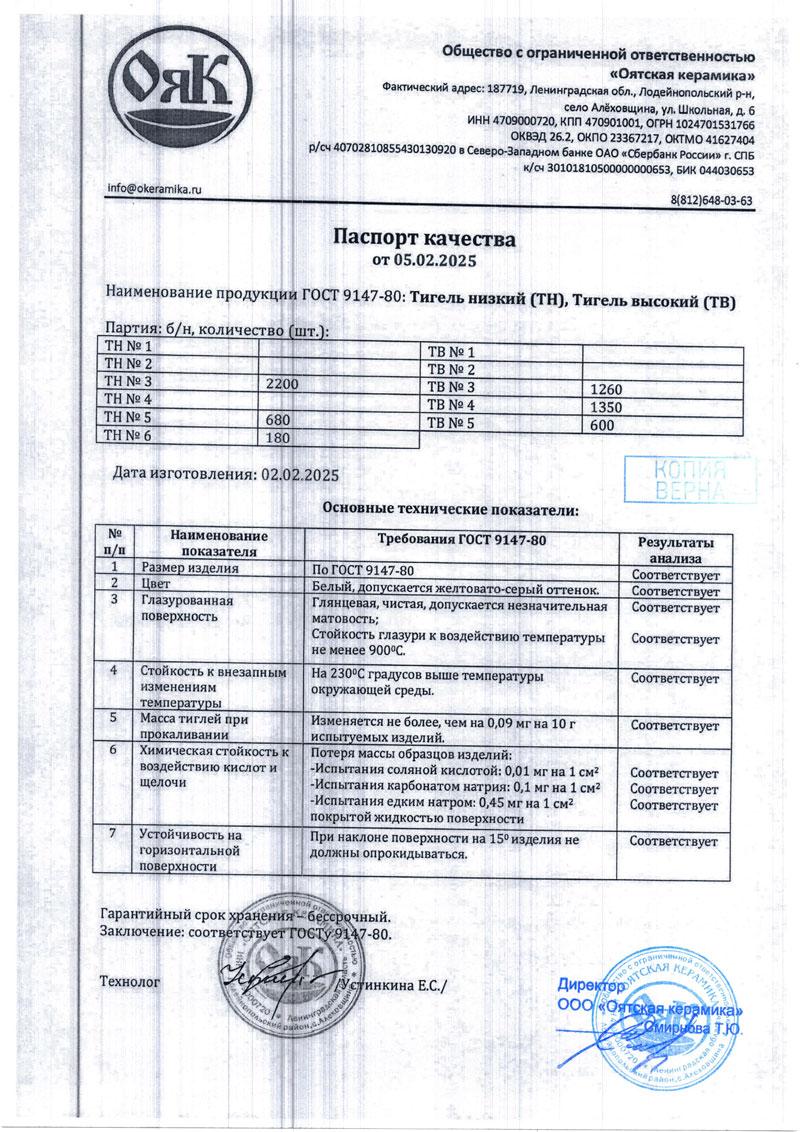 - Тигель низкий, Тигель высокий. Паспорт качества от 22.10.2025