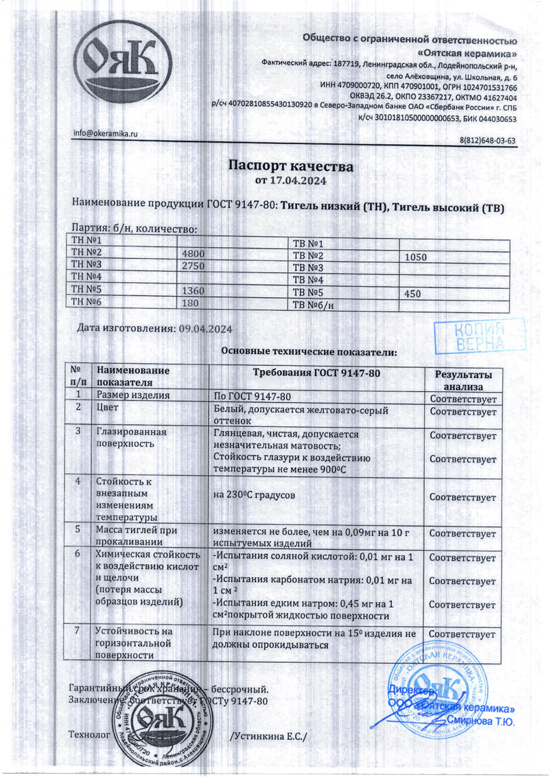 - Тигель низкий, Тигель высокий. Паспорт качества от 17.04.2024