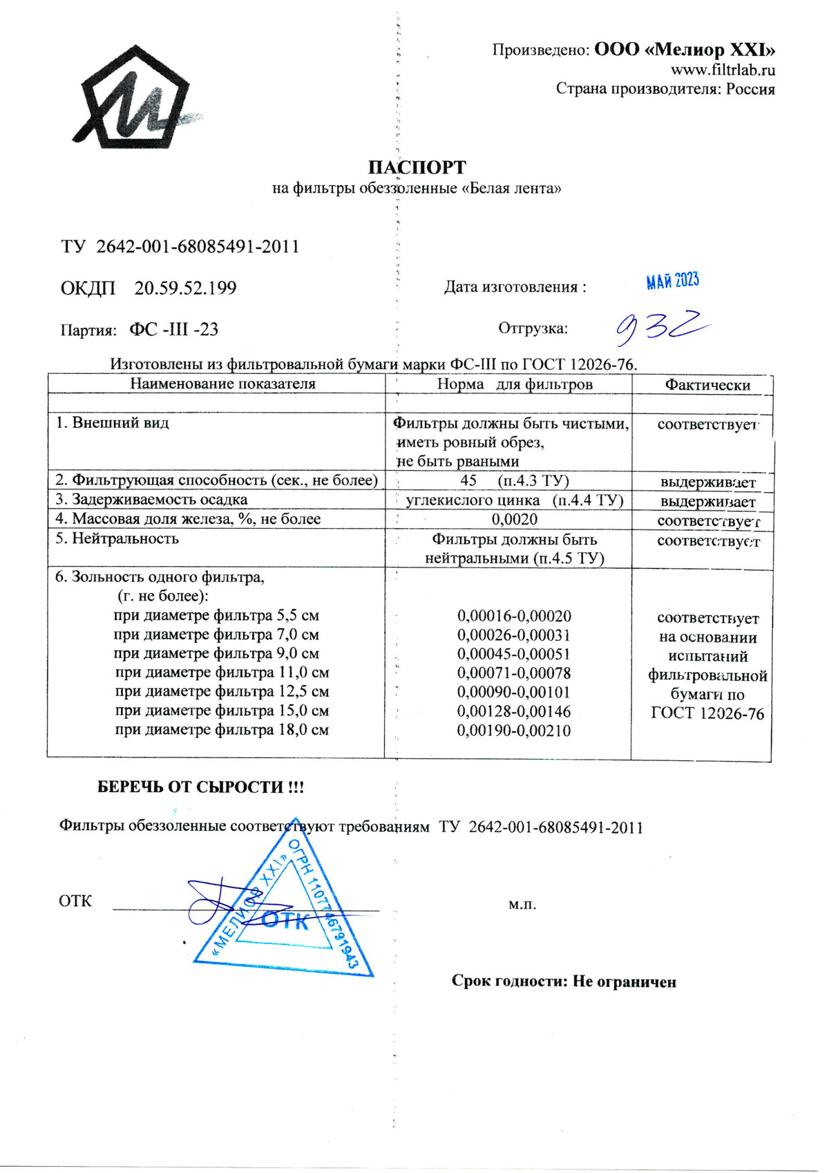 - Фильтры обеззоленные. Мелиор ХХI. Сертификат соответствия до 25.09.2026