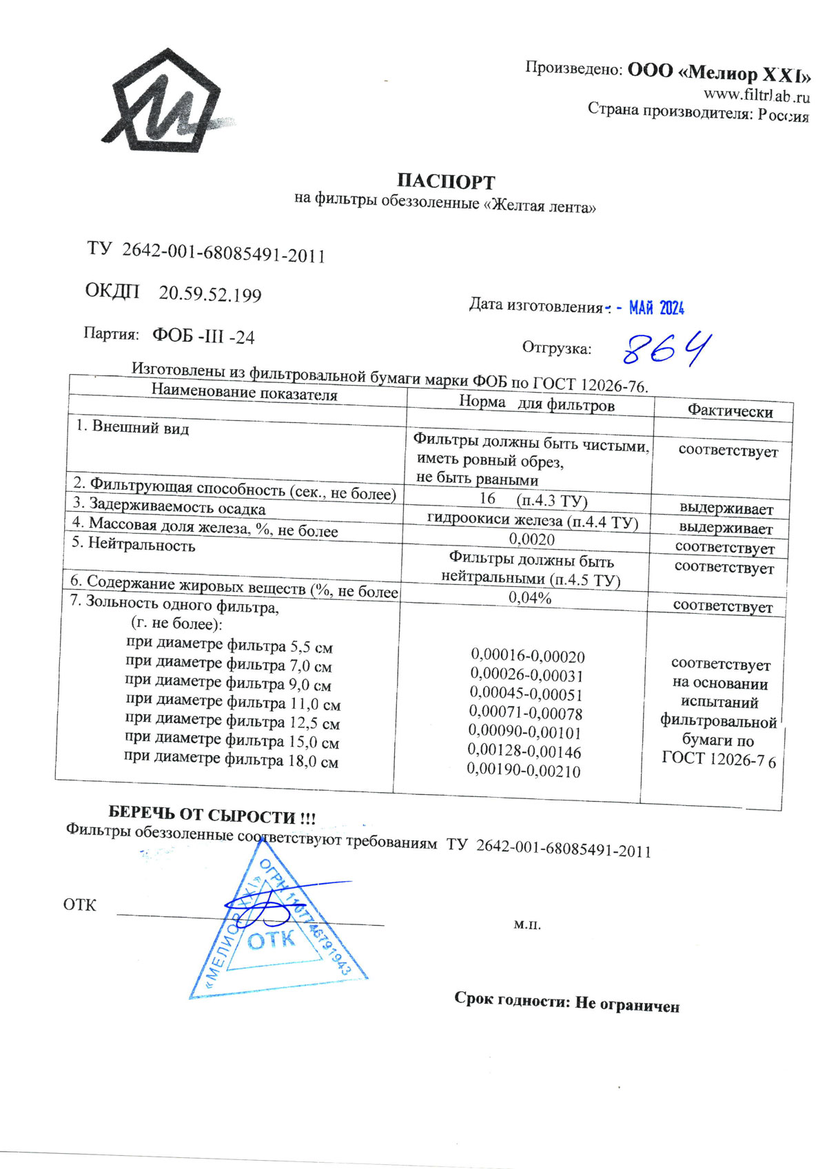 - Фильтры обеззоленные. Мелиор ХХI. Сертификат соответствия до 25.09.2026