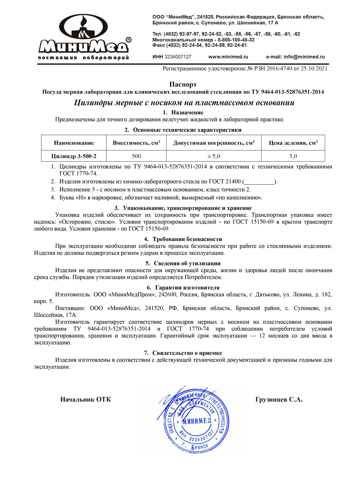 - Цилиндры 500 мл исп. 3. МиниМедПром. Свидетельство ТСИ Беларусь до 28.02.2028