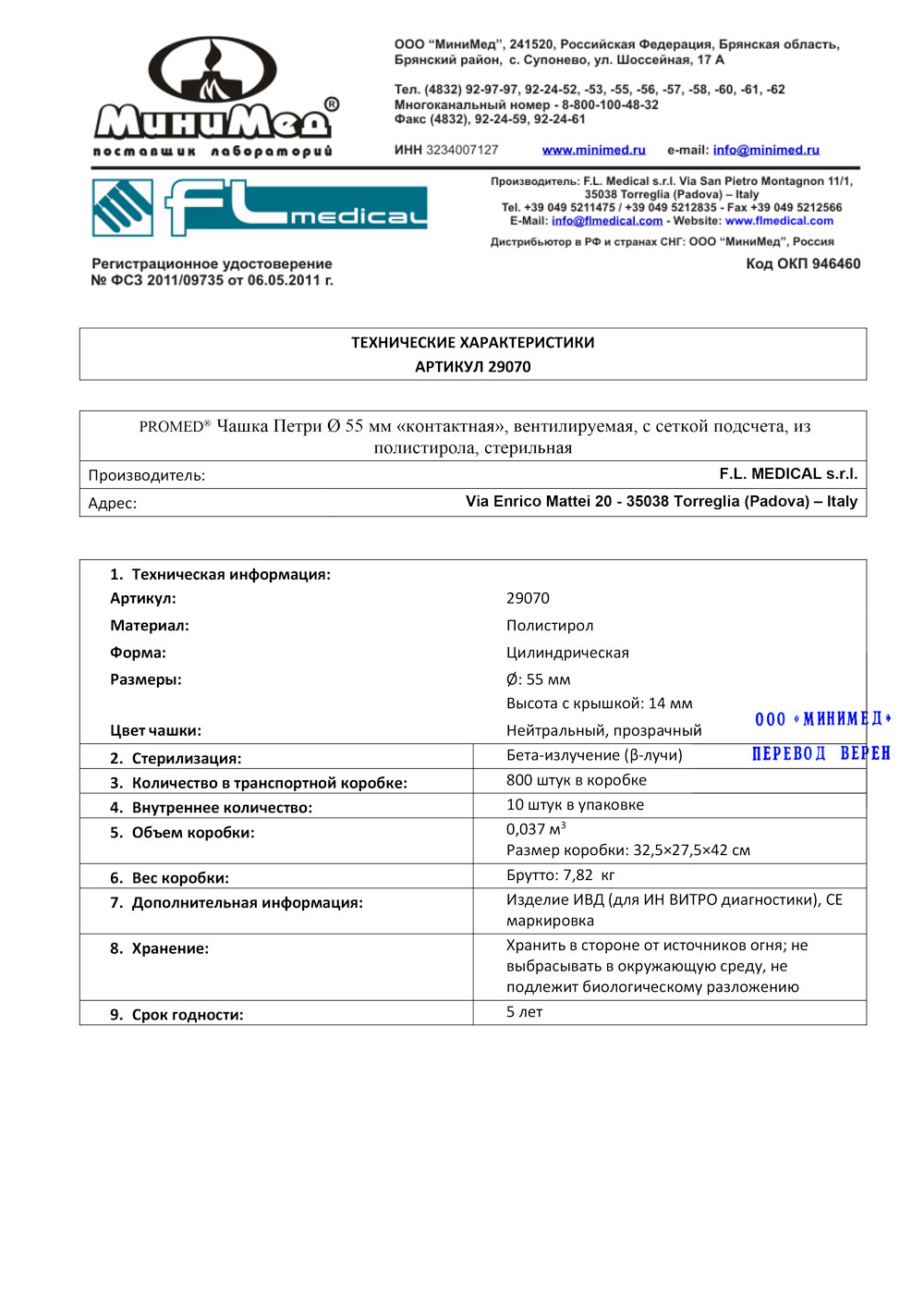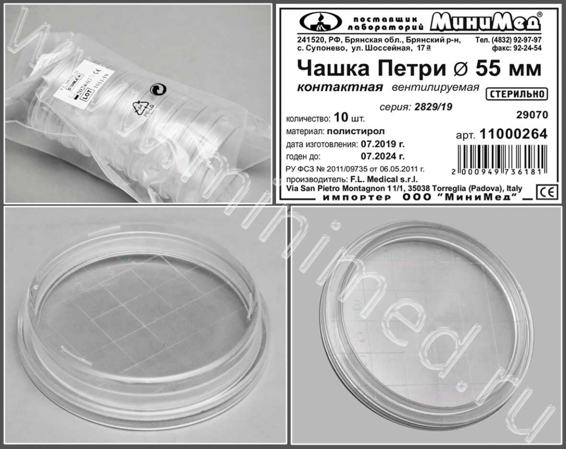 Чашка Петри, контактная, диаметр 55 мм, внешний диаметр 65 мм, стер., вентилир.,п/с, FL medical, уп.10/800 шт,