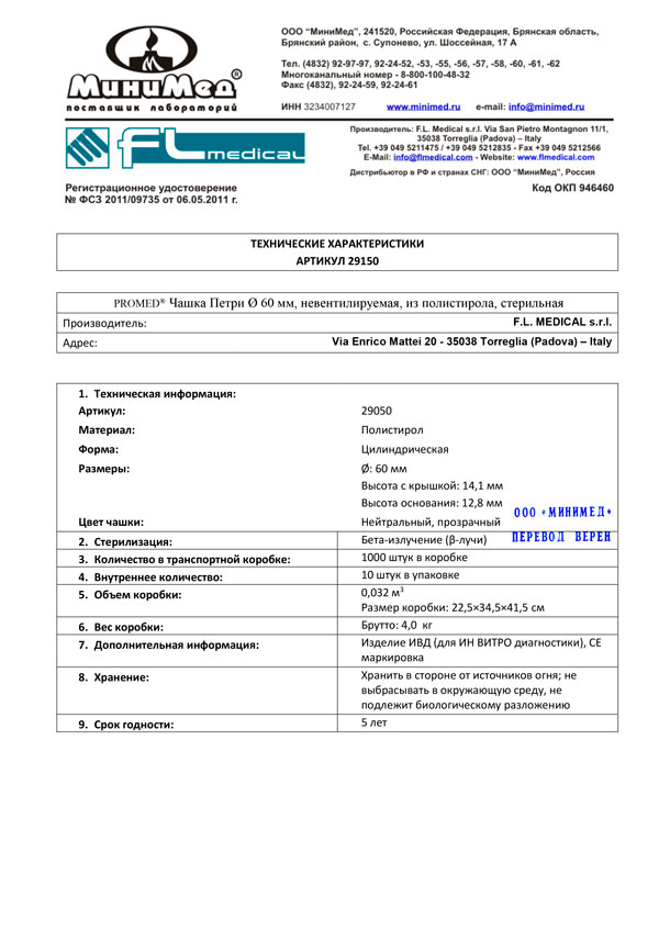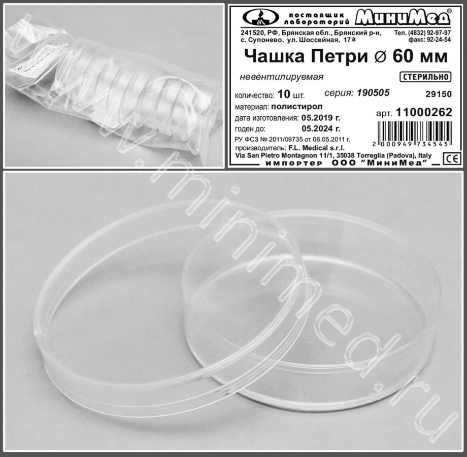 Чашка Петри, Ø 60 мм,невентилируемая, стерильная, п/с, FL medical, уп.10/1080 шт,