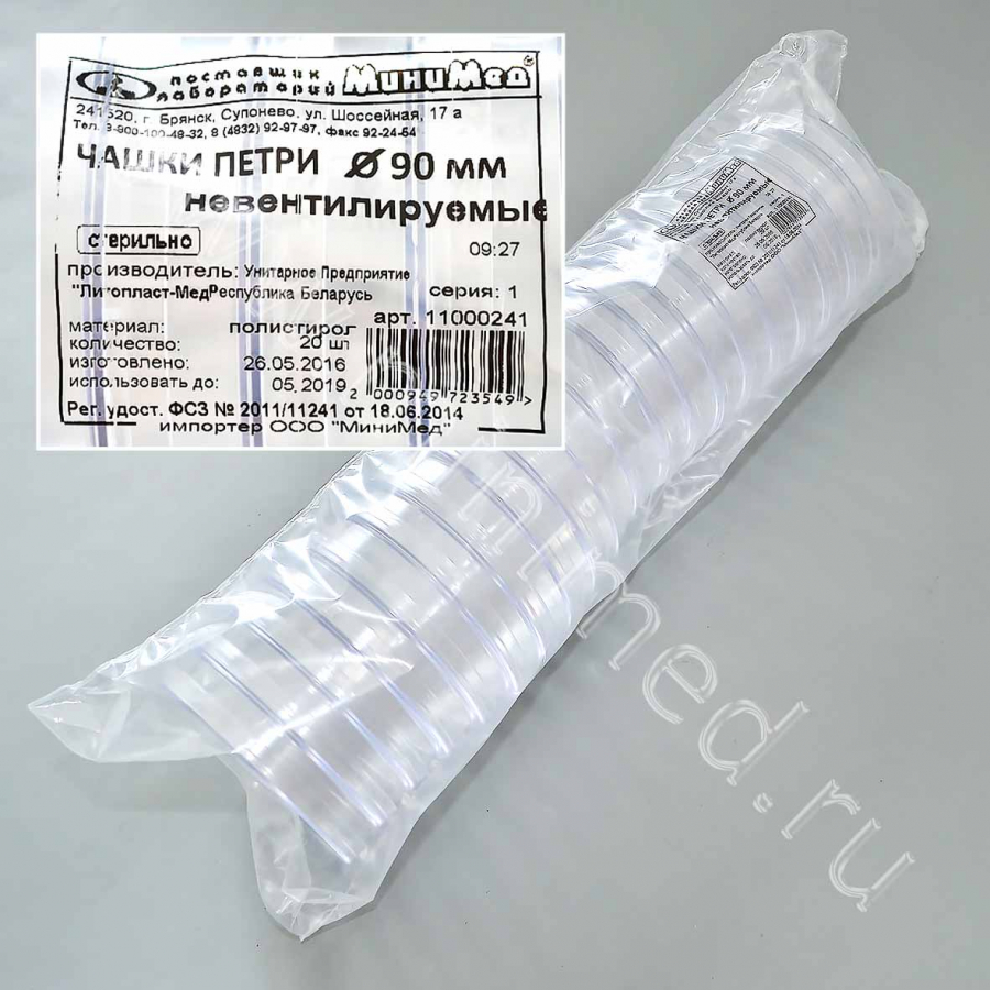 Чашка Петри пластмассовая однократного применения диаметром 90 мм невентилируемая, односекционная в групповой упаковке стерильная, Литопласт, уп.20 шт