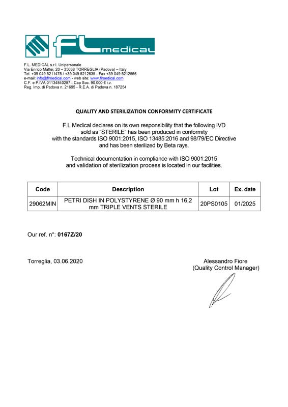 Чашка Петри, Ø 90 мм, стерильная, п/с, FL medical, уп.20/480 шт,