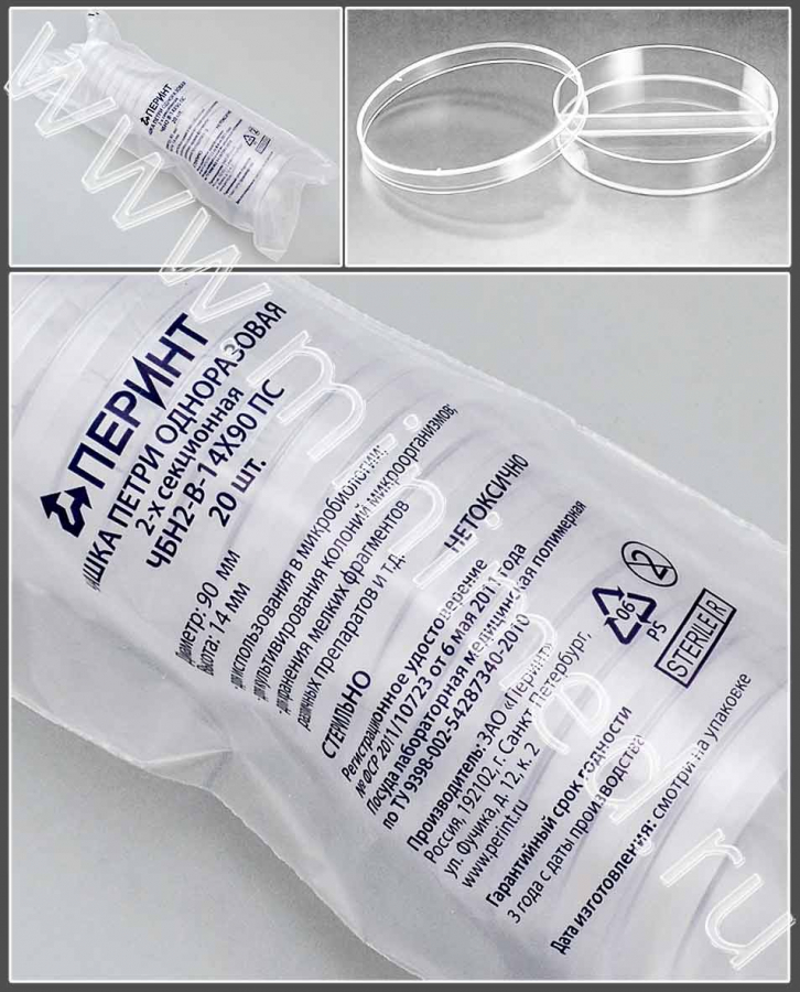 Чашка Петри одноразовая двухсекционная ЧБН2-В-14*90 ПС ГУ СТЕРИЛЬНО, Перинт, уп.20шт/кор.480 шт