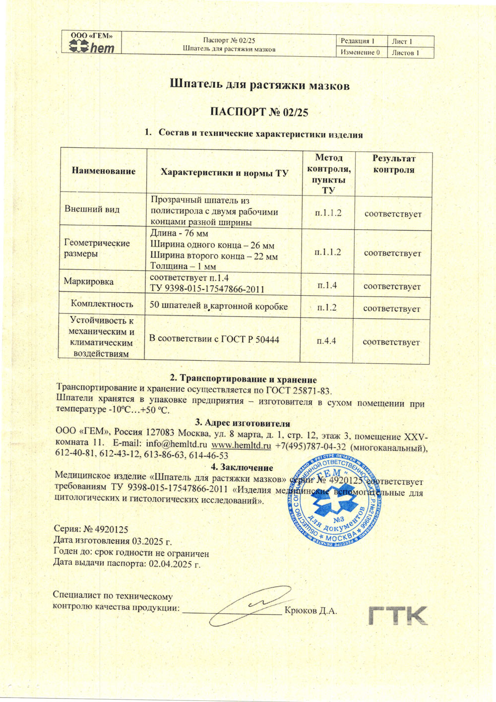 Шпатель предназначен для изготовления мазков крови на предметных стеклах. Изготовлен из специального полупрозрачного механически прочного полистирола. Предназначен для однократного применения, но может подвергаться обработке детергентами и стандартными дезинфицирующими средствами. Термической стерилизации не подлежит.
