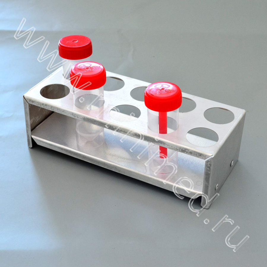 Штатив изготовлен из алюминия, что позволяет стерилизовать их при любом температурном режиме; данный материал обеспечивает легкость и долговечность. Может использоваться в водяных банях. Штатив имеет индивидуальную упаковку. Предназначен для хранения контейнеров объемом до 30 мл.