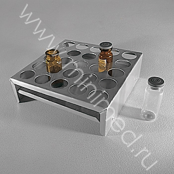 Штатив изготовлен из алюминия, что позволяет стерилизовать их при любом температурном режиме; данный материал обеспечивает легкость и долговечность. Может использоваться в водяных банях. Штатив имеет индивидуальную упаковку. Предназначен для хранения пенициллиновых флаконов на 10 и 15 мл.