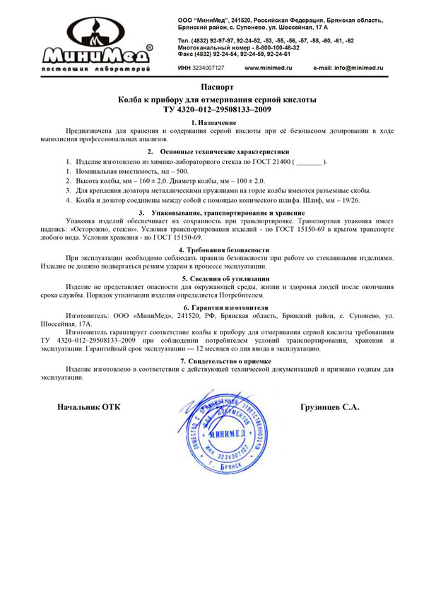 Колба к прибору для отмеривания серной кислоты,500мл, МиниМед, уп. 2 шт
