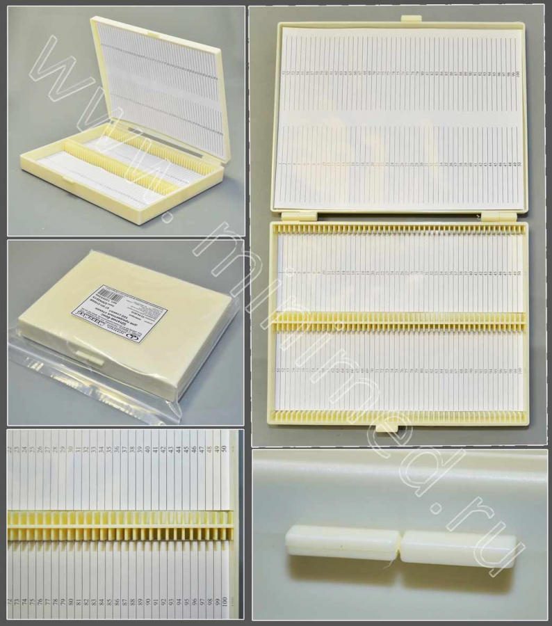 Штатив-бокс предназначен для хранения микропрепаратов на предметных стеклах размером 76х26 мм, толщиной 2 мм. Имеет нумерованные ячейки и поля для записи. Изготовлен бокс-штатив из полистирола. Индивидуальная упаковка. Рабочий диапазон температур - от -30 до +60°С.