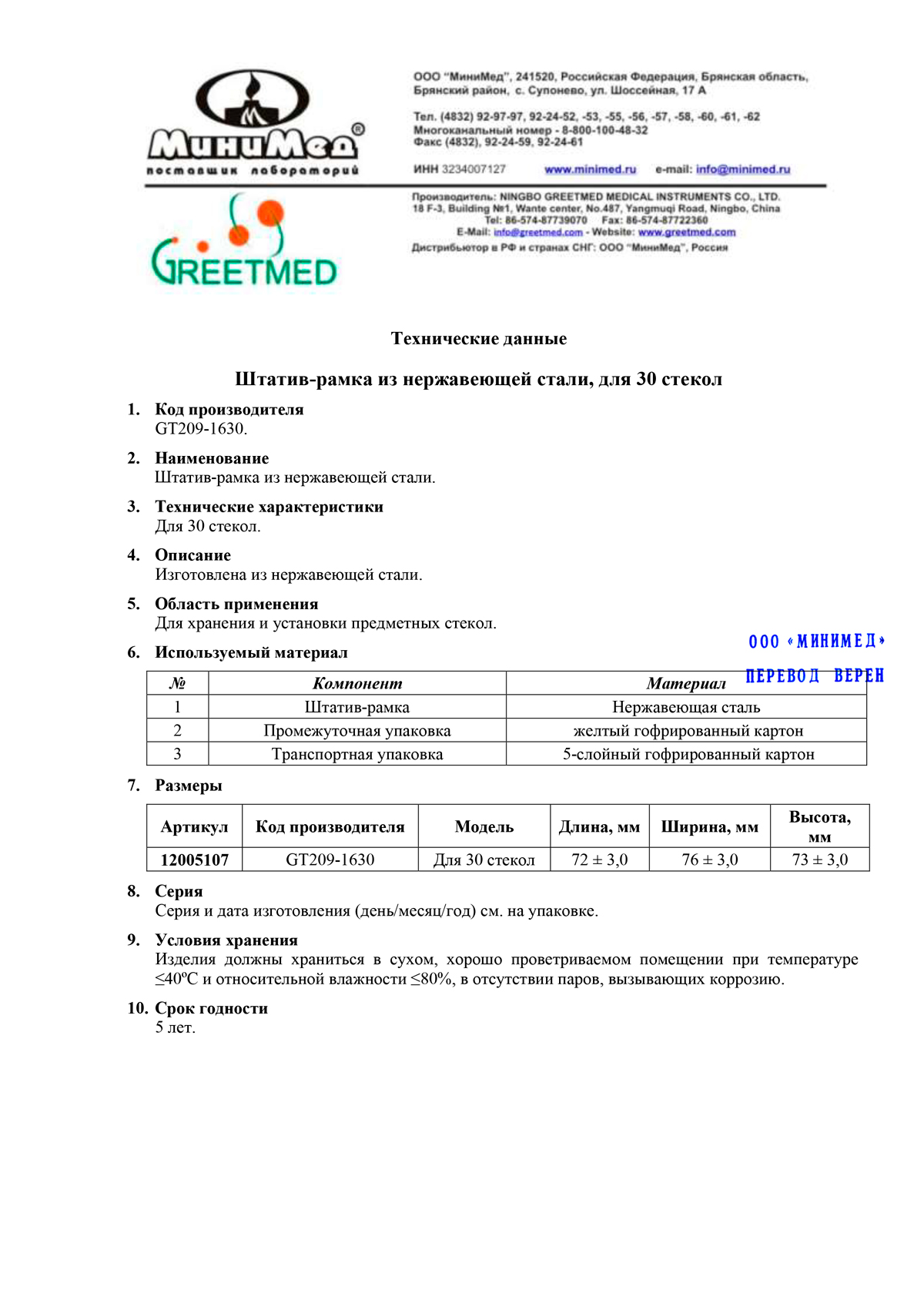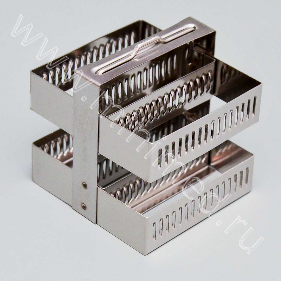 Штатив - рамка предназначена для размещения предметных стекол 76x26x2 мм, максимальное количество —30 шт. Вертикальная загрузка стекол. Изготовлена из нержавеющей стали.