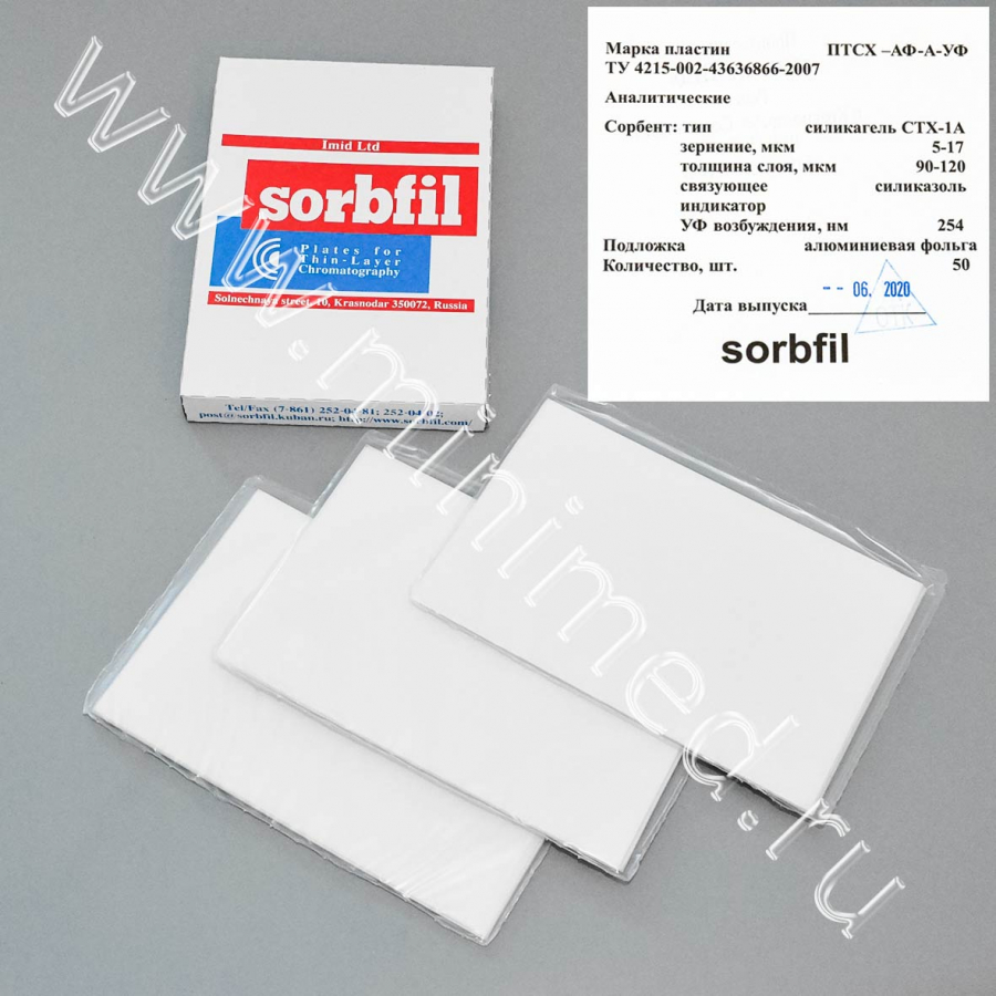 Пластины Sorbfil (ТУ 4215-002-43636866-2007) предназначены для проведения анализа веществ методом тонкослойной хроматографии. Пластины Sorbfil выпускаются на полимерной (полиэтилентерефталатной) или алюминиевой подложке с нанесённым рабочим слоем фракционированного широкопористого силикагеля с толщиной 90-120 мкм, закреплённого специальным связующим компонентом. Допустимая толщина слоя сорбента на одной пластине составляет ±5 мкм.