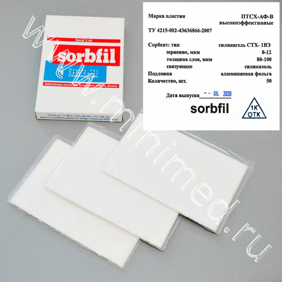 Пластины Sorbfil (ТУ 4215-002-43636866-2007) предназначены для проведения анализа веществ методом тонкослойной хроматографии. Пластины Sorbfil выпускаются на полимерной (полиэтилентерефталатной) или алюминиевой подложке с нанесённым рабочим слоем фракционированного широкопористого силикагеля с толщиной 90-120 мкм, закреплённого специальным связующим компонентом. Допустимая толщина слоя сорбента на одной пластине составляет ±5 мкм.