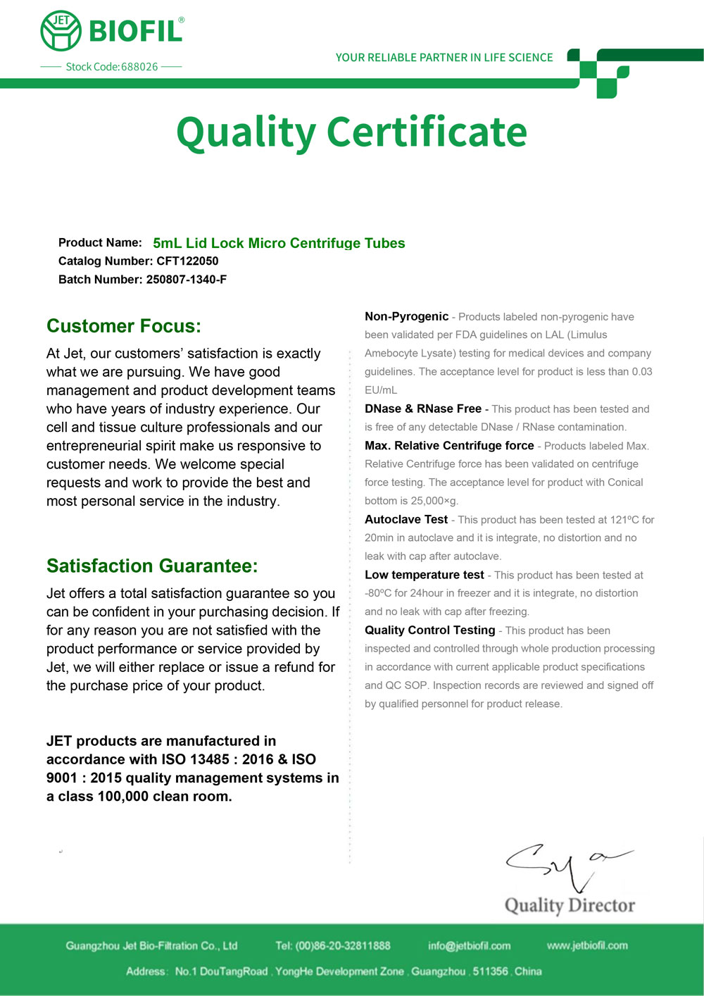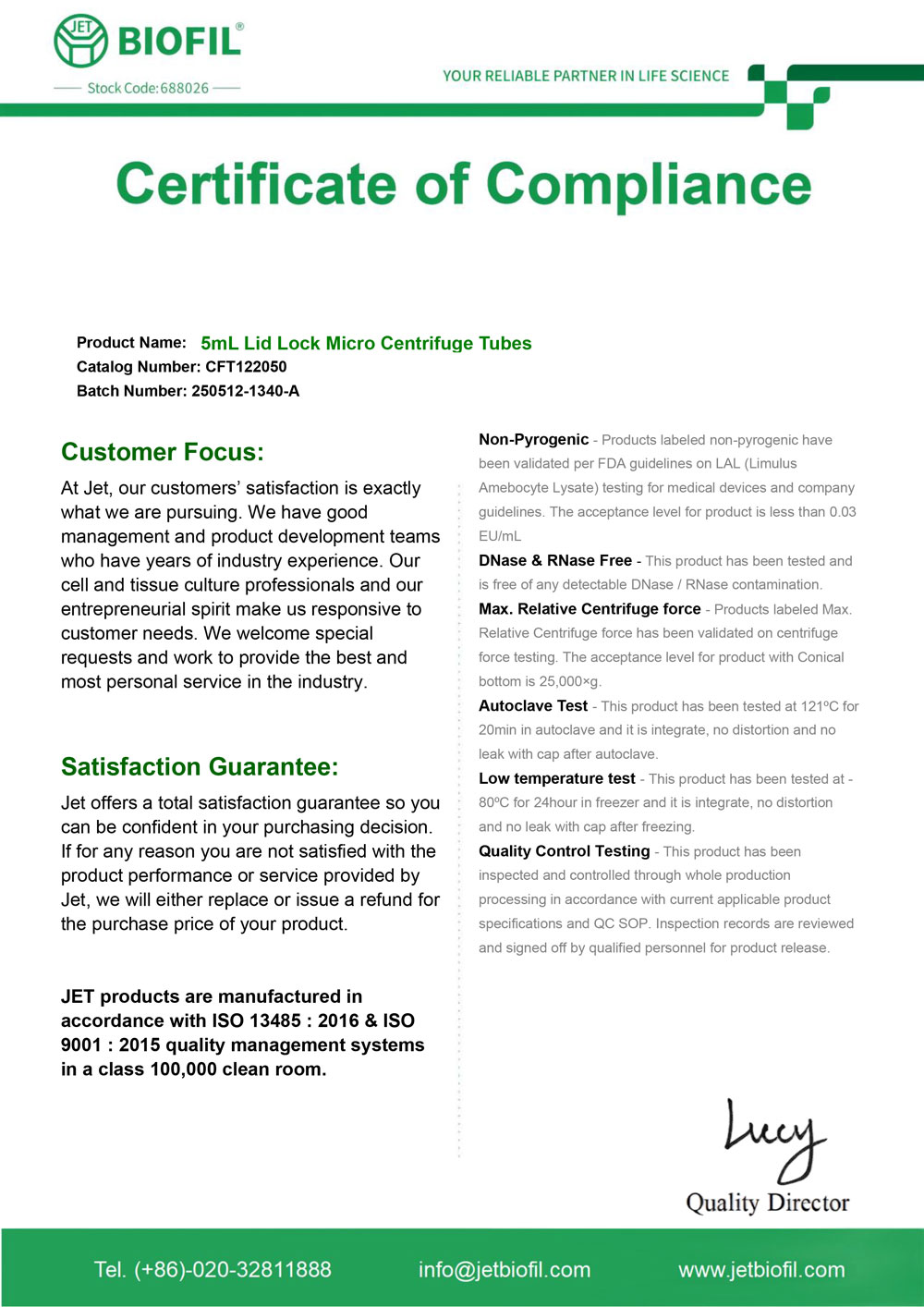 - Сертификат. Микропробирка 5 мл, тип Эппендорф, с дел., Jet Bio-Filtration, CFT12