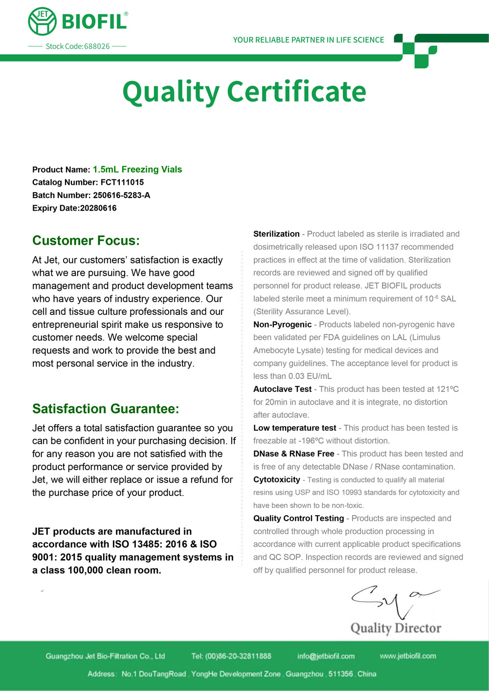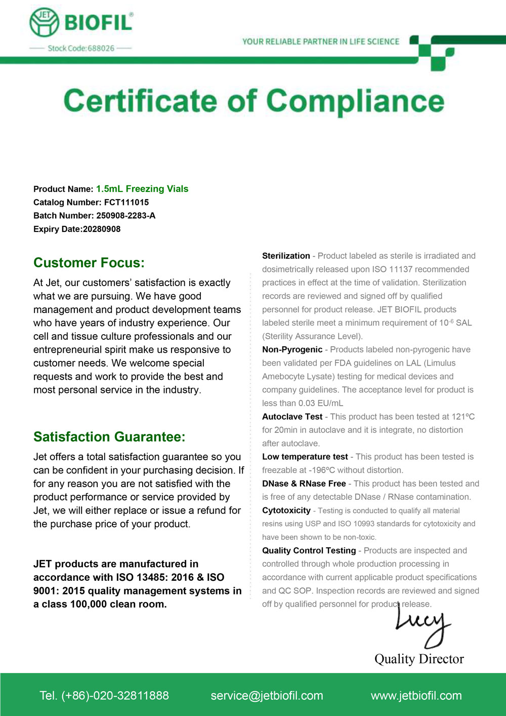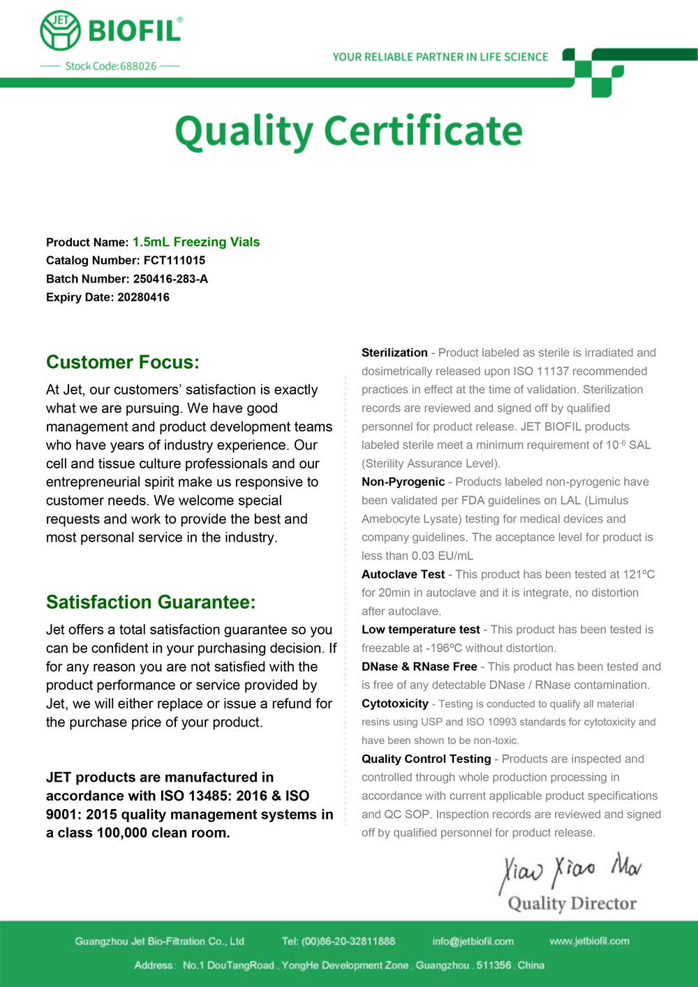 - Сертификат. Микропробирка для криохранения 1,5 мл, с основанием, Jet Bio-Filtrat