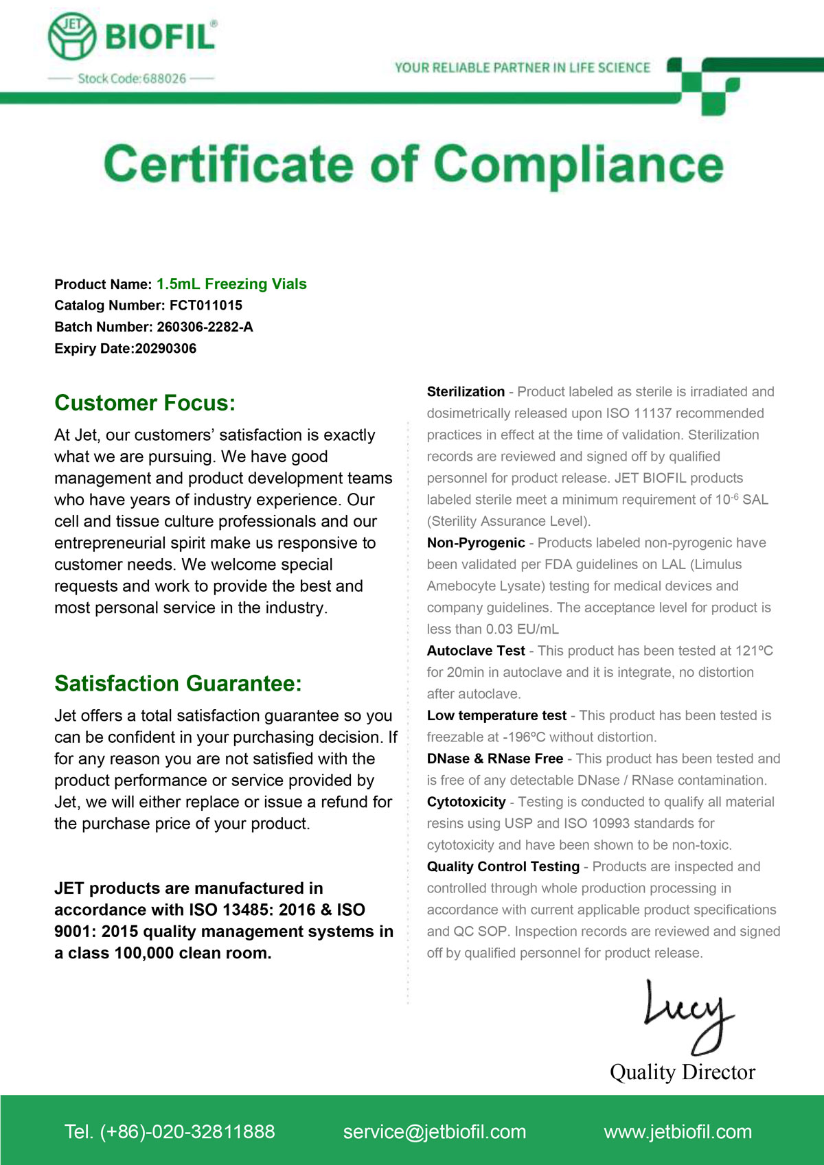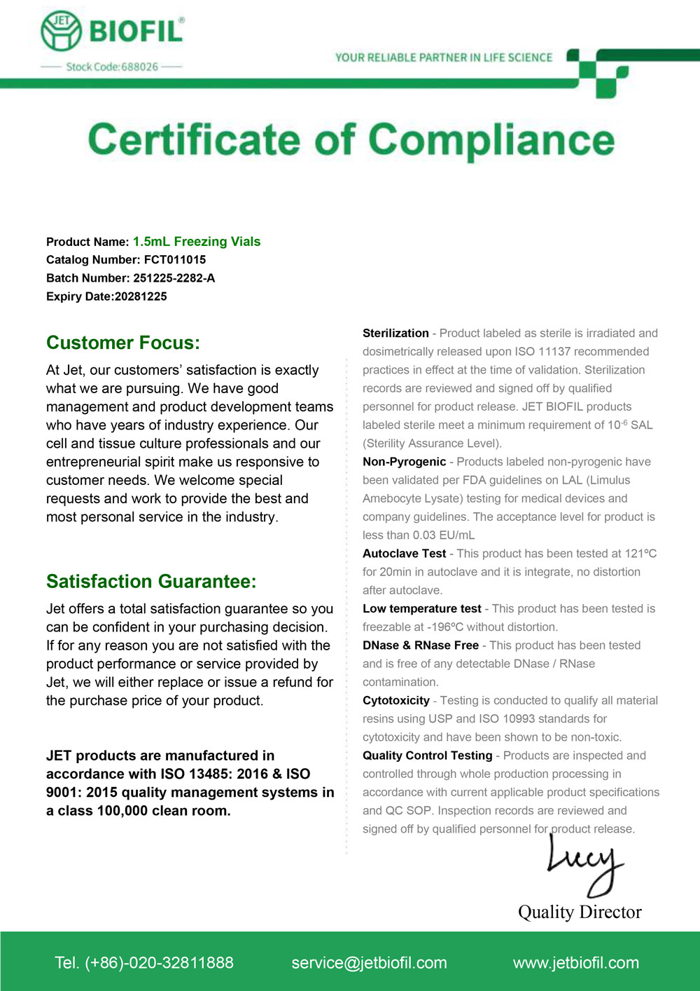 - Сертификат. Микропробирка для криохранения 1,5 мл, стер., Jet Bio-Filtration-FCT
