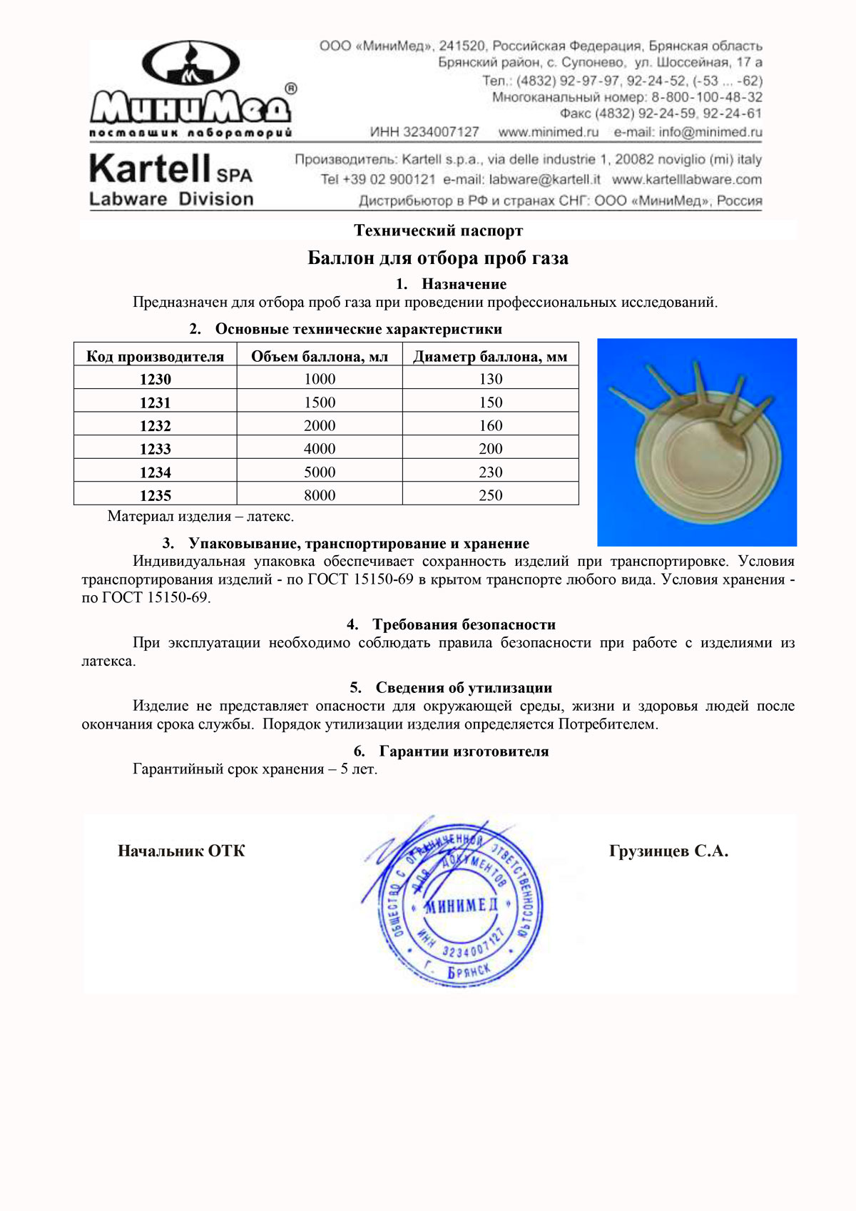Баллон для отбора проб газа 4000 мл, латекс, Kartell, уп.1 шт
