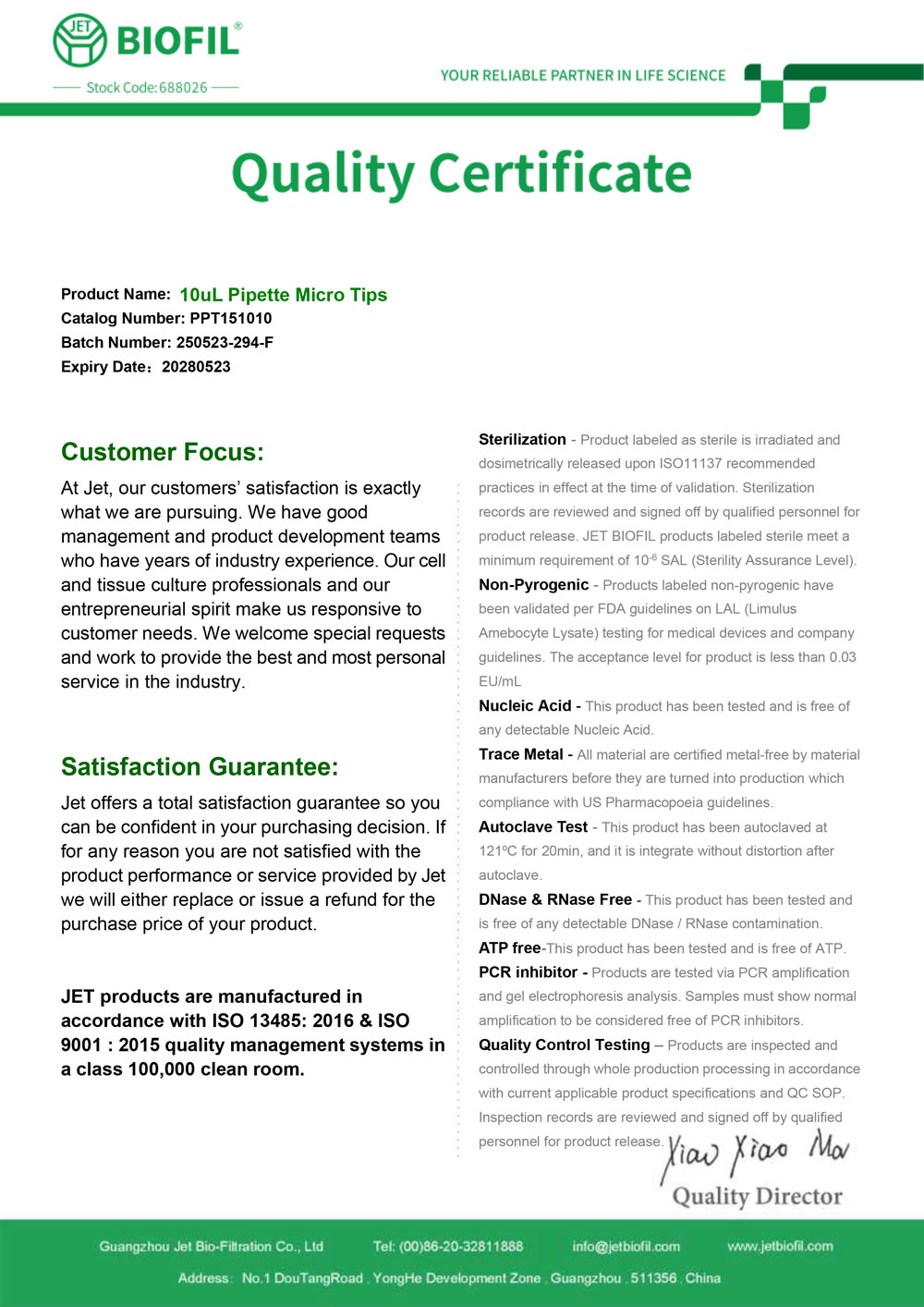- Сертификат. Наконечник для дозаторов 0,1-10 мкл, Jet-Bio-Filtration, PPT151010 с.