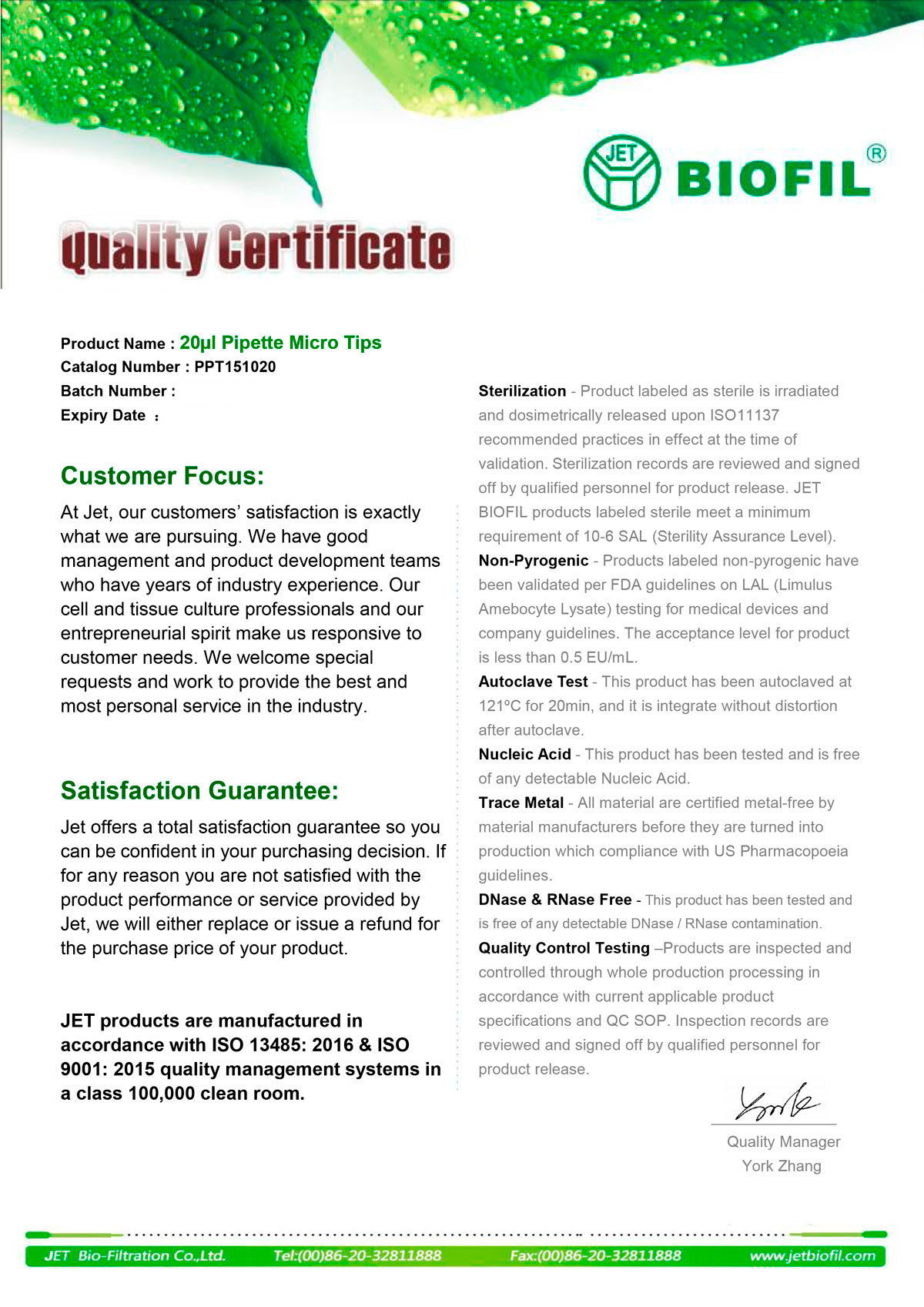- Сертификат. Наконечник для дозаторов 2-20 мкл, Jet-Bio-Filtration, PPT151020 с.