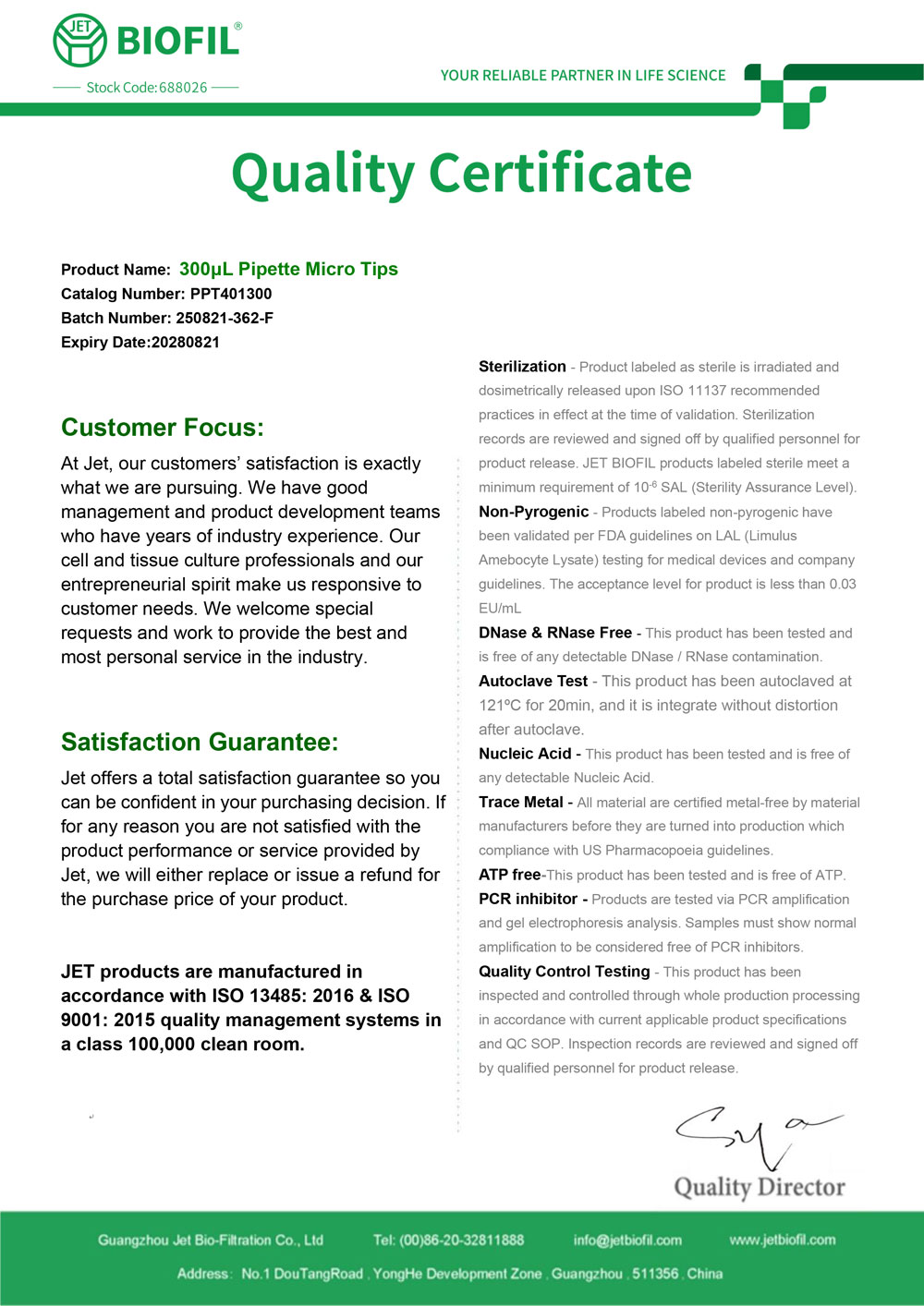 - Сертификат. Наконечник для дозаторов 10-300 мкл, Jet-Bio-Filtration, PPT401300 с