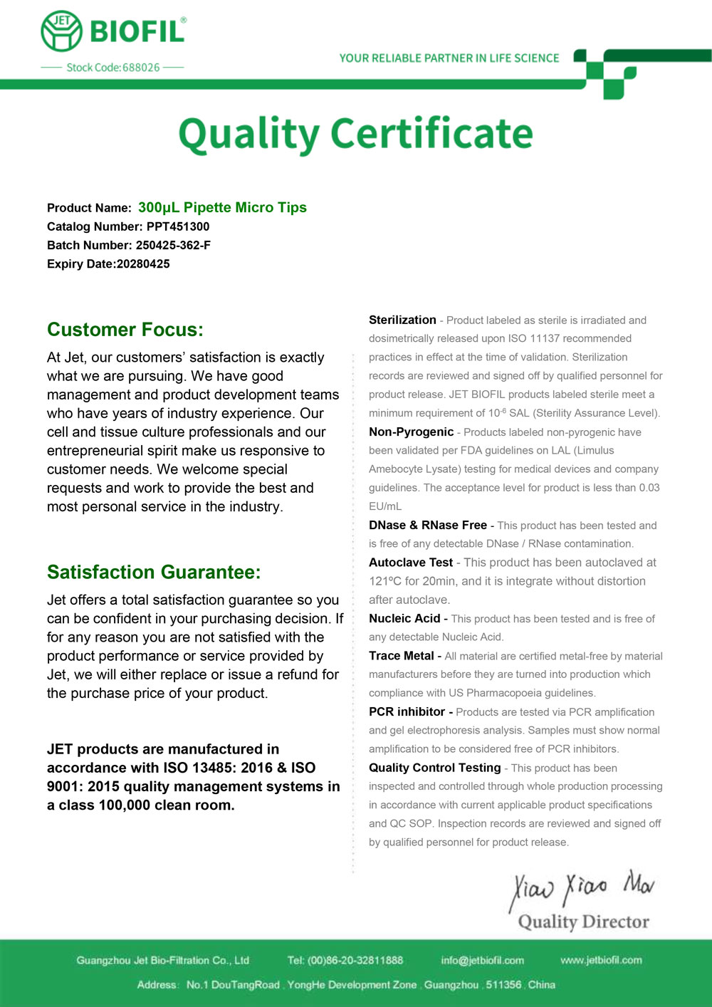 - Сертификат. Наконечник для дозаторов 10-300 мкл, Jet Bio-Filtration, PPT451300 с.
