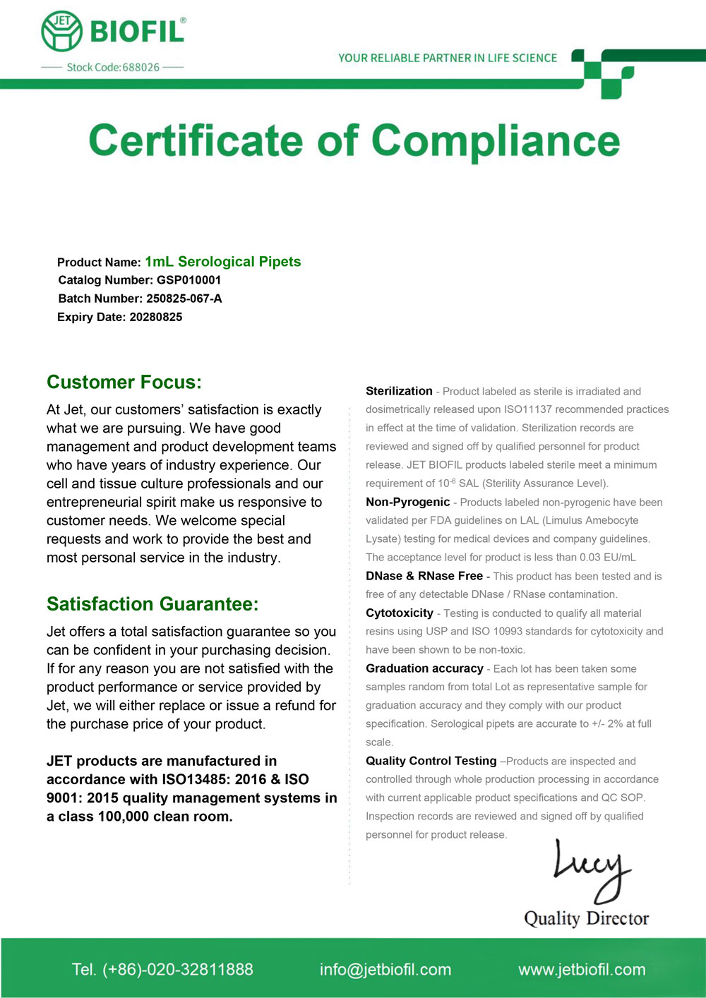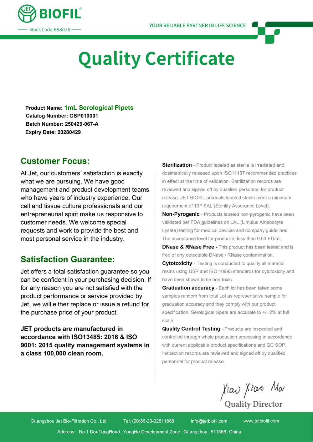 - Сертификат. Пипетка серологическая 1 мл, для ПЦР. Jet Bio-Filtration GSP010001 c
